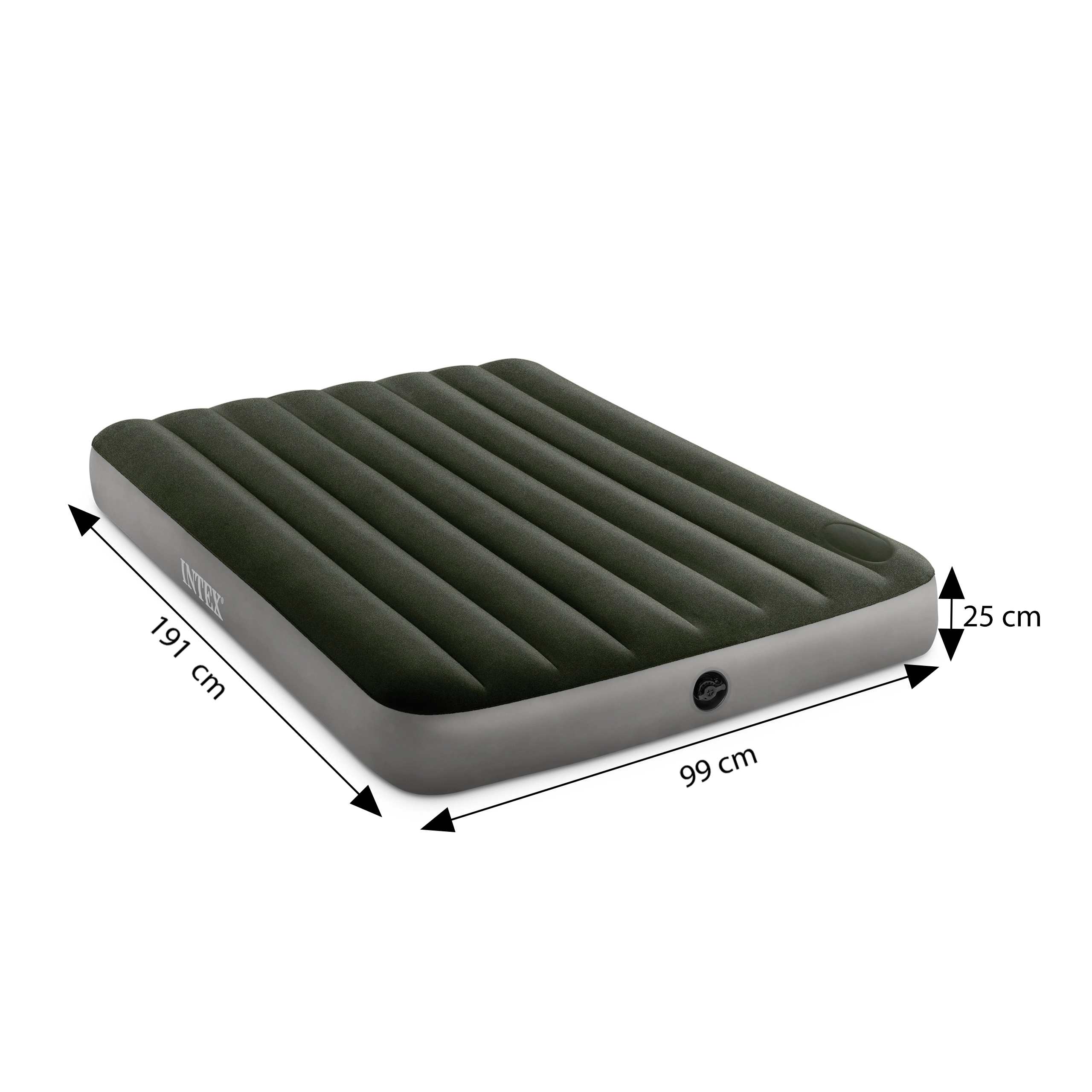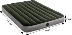 Izmēri 191 × 99 × 25 cm piedāvā ērtu vietu vienai pieaugušai personai. Kvalitatīvais PVC ir viegli kopjams, bet ūdensizturīgais floks palielina komfortu un kalpošanas ilgumu. Komplektā iekļauta arī ielāpa ātriem labojumiem.