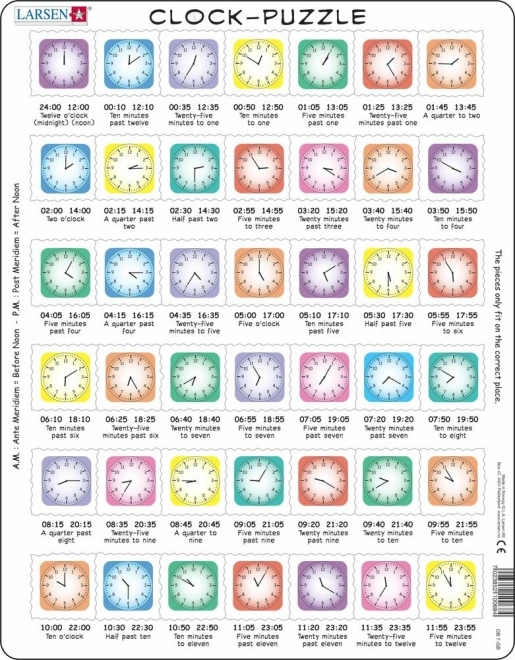 Izglītojošā LARSEN puzle ar pulksteņa motīvu ir lielisks palīglīdzeklis pirmajiem soļiem laika izpratnē. Bērni rotaļīgā veidā apgūs, kad ir laiks brokastīm, pusdienām vai vakariņām, un vienlaikus iemācīsies lasīt laiku uz rādītājpulksteņa. Kvalitatīvs kartons un izturīgi gabali nodrošina ilgu kalpošanas laiku arī pie atkārtotas lietošanas.