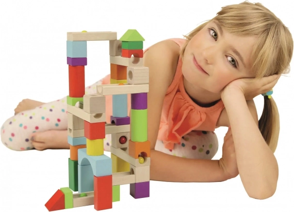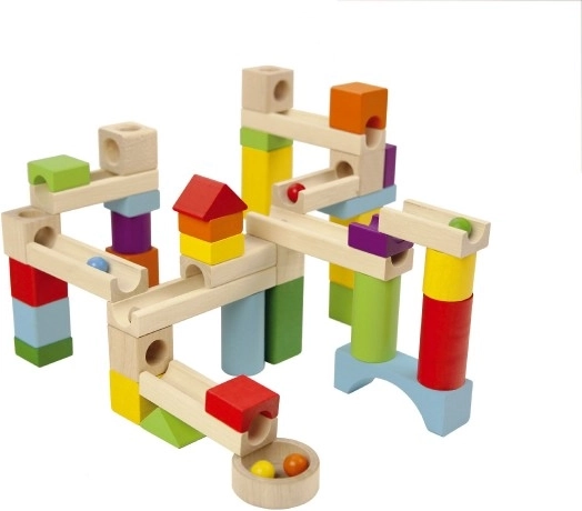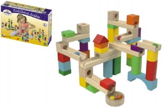 Šī koka lodīšu trase piedāvā dažādus ceļus lodītēm, veicinot radošumu un motorisko prasmju attīstību.