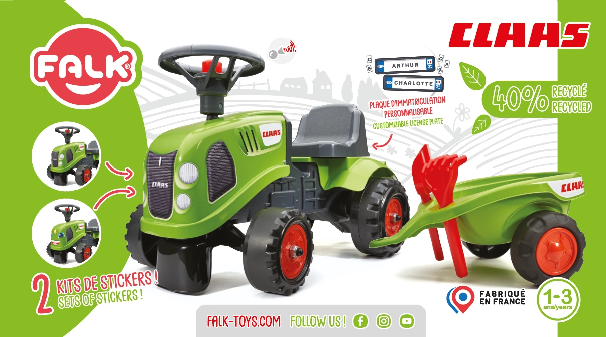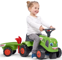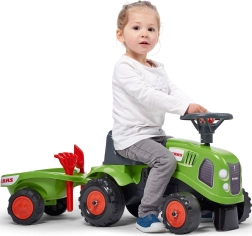 Komplektā iekļauta noņemama piekabe, grābeklis, lāpstiņa un uzlīmes – bērni var pielāgot traktoru un baudīt vēl daudzveidīgākas rotaļas.