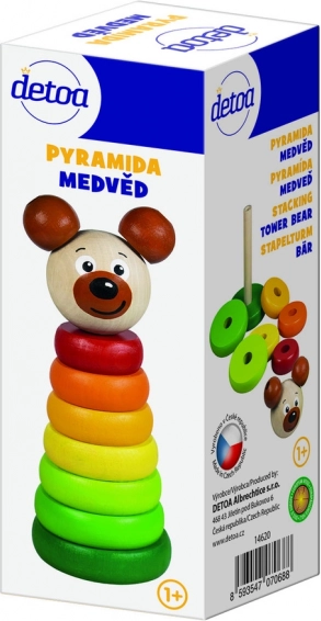 Tradicionāla koka saliekamā piramīda ar mīlīgu lāča galviņu izceļas ar košām krāsām un palīdz bērniem no 1 gada vecuma attīstīt sīko motoriku, loģiku un formu un krāsu atpazīšanu. Pateicoties izturīgajam izpildījumam, noapaļotajām malām un 8 detaļām tā ir droša, ilgmūžīga un ražota Čehijā.