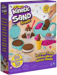 Ienirstiet saldu radījumu pasaulē ar Kinetic Sand Scents – saldējuma gardumu komplektu. Aromātiskās, zviedru kvalitātes smiltis, pateicoties unikālajai struktūrai, viegli veidojas, nelīp pie rokām un neizžūst, tāpēc bērni var spēlēties atkal un atkal. Ar formiņām un rīkiem viegli pagatavot bumbiņas, sendvičus, kokteiļus un vafeles.
