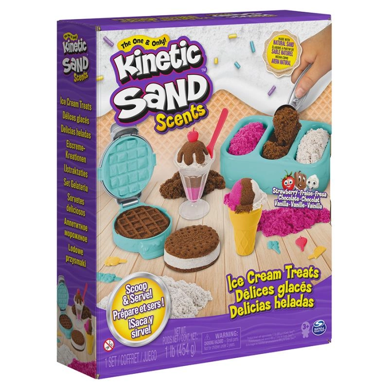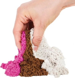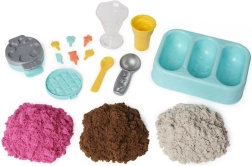 Kinetic Sand īpašais sastāvs ļauj smiltis viegli mīcīt, griezt un veidot – ideāli reālistiskiem saldējuma bumbiņām un desertiem.