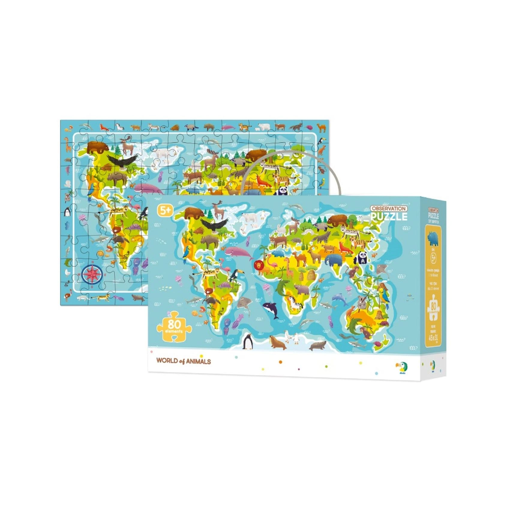Atklājiet faunas pasauli ar šīm košajām puzlēm, kas bērnus ne vien izklaidē, bet arī māca. Pēc salikšanas var spēlēt spēli Atrodi un meklē un noteikt dzīvnieku atrašanās vietu pasaules kartē. Izglītojoša puzle ar 80 gabaliņiem veicina uzmanības attīstību, sīko motoriku un loģisko domāšanu.