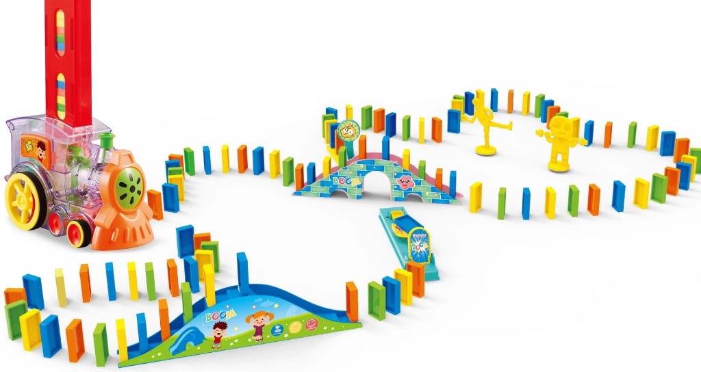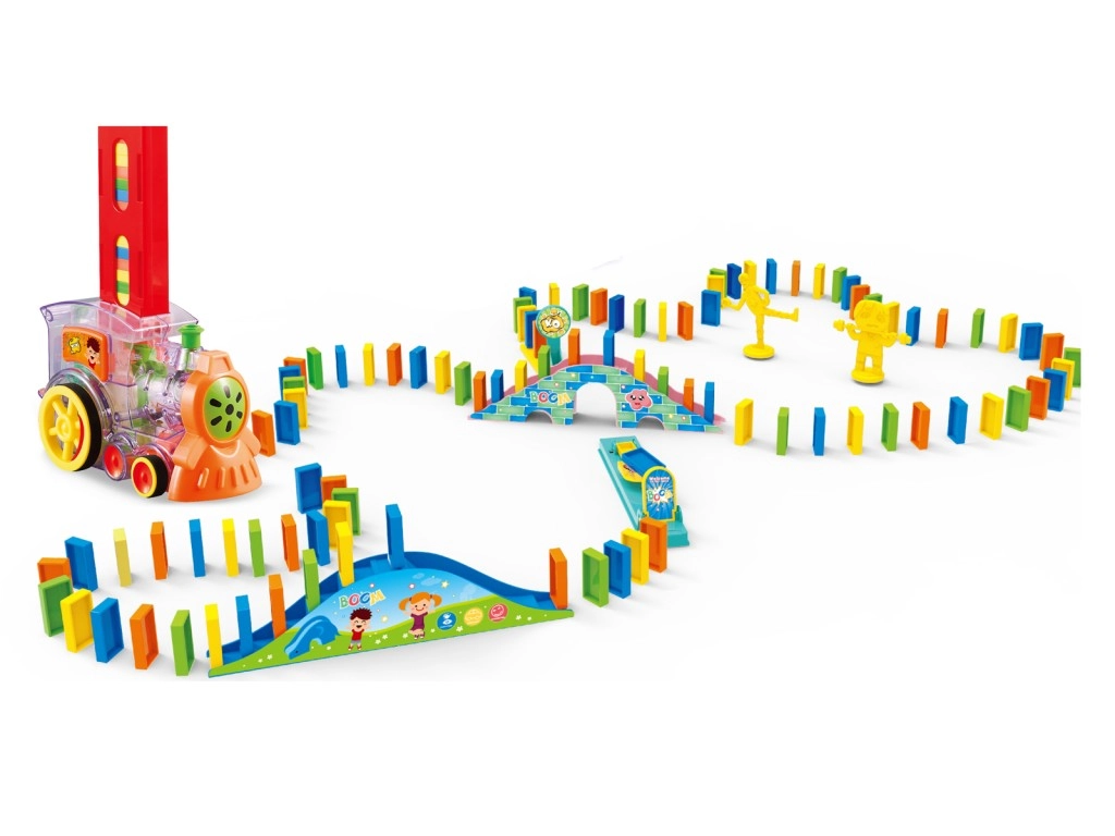 Aizraujošs vilcieniņš ar domino bērniem no 3 gadu vecuma sniedz stundām ilgu radošu spēli. Braucošais vilcieniņš automātiski saliek domino kauliņus rindā, un bērni var vērot to iespaidīgu ķēdes reakciju. Attīsta sīko motoriku, radošumu, koncentrēšanos un loģisko domāšanu. Nepieciešamas 2× AA baterijas (nav iekļautas komplektā).