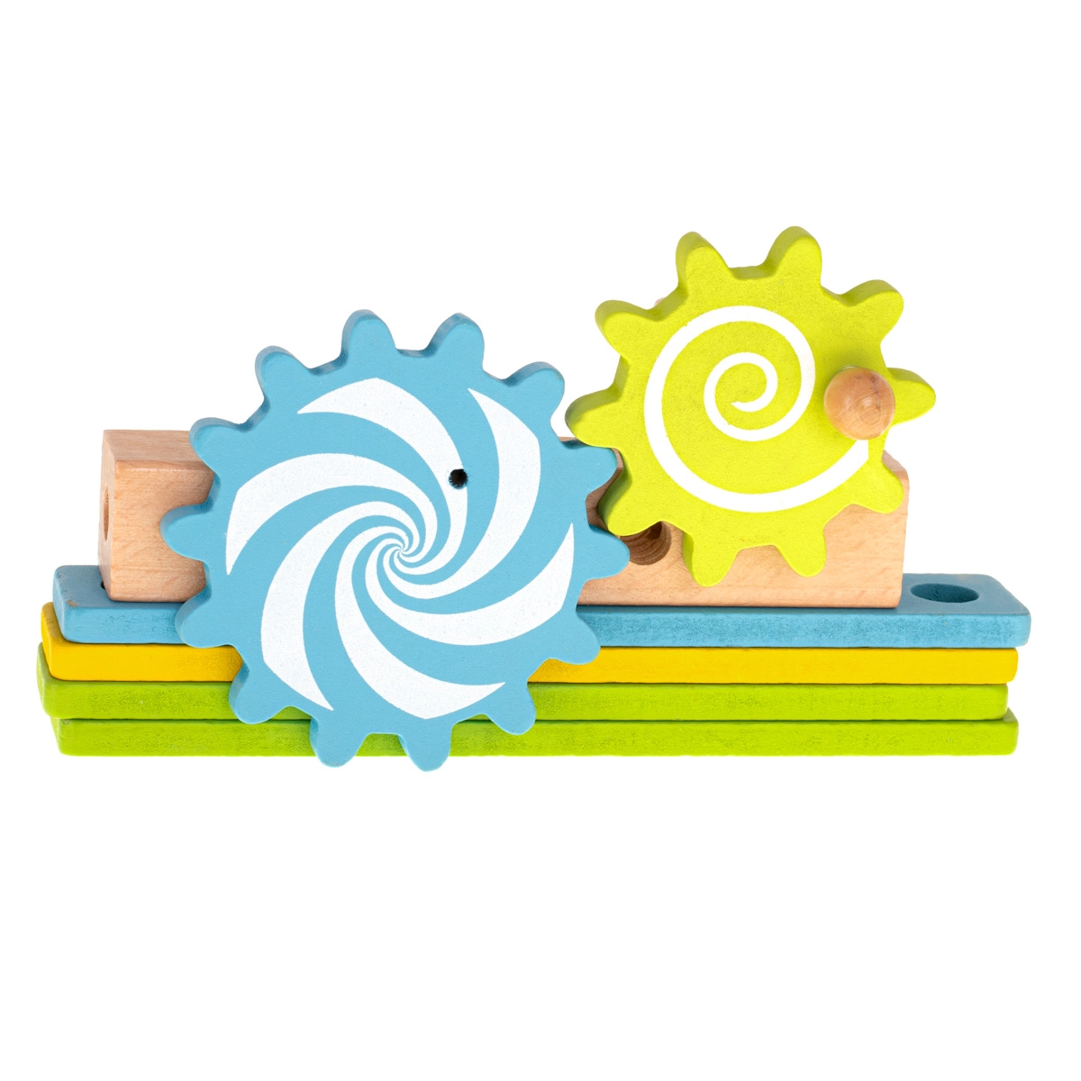 Komplektā ir koka skrūvgriezis un atslēga, tāpēc mazajiem būvētājiem ir viss nepieciešamais. Košās detaļas ar rotaļīgiem motīviem (piem., lauvēns un zobrati) veicina radošu spēli un māca atpazīt krāsas. Lieliska izvēle kā izglītojoša rotaļlieta un dāvana, kas izklaidēs stundām.