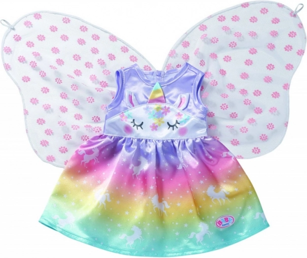 Padariet rotaļas gaišākas ar burvīgu kleitiņu BABY born lellei 43 cm. Varavīksnes krāsas, vienradža motīvs un smalki fejas spārniņi veicina bērnu fantāziju. Izturīgs izpildījums un viegla uzvilkšana ir ideāli piemēroti ikdienas spēlēm.
