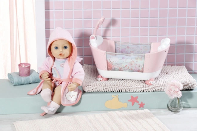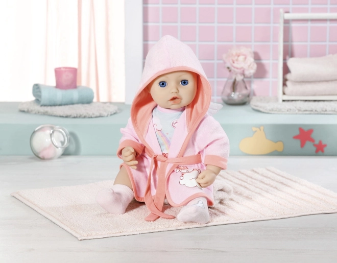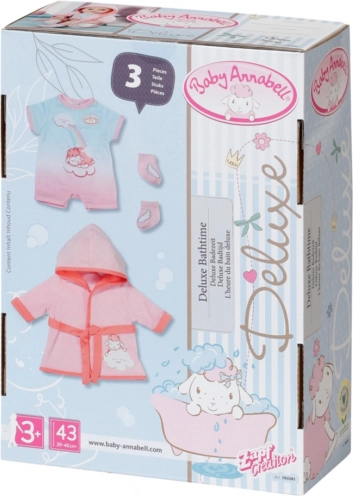 Ļaujiet savai Baby Annabell piedzīvot burvīgus mirkļus ar šo stilīgo halātu un pidžamu. Halātu rotā spārni, kas padara to ne vien stilīgu, bet arī ērtu aksesuāru rotaļām. Zem halāta lelle valkā īsu kombinezoniņu ar aitiņas apdruku, kas izbauda varavīksnes dušu. Lai lelles kājiņas būtu patīkami siltas, komplektā ietilpst arī rozā zeķes ar spārniņu attēliem.