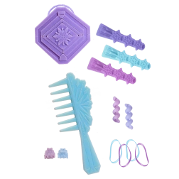 - Ķemmējamā galva, birste, 5 matadatas (3 ar sniegpārsliņu), 4 gumijas (violetas un zilas), liela sniegpārsliņas formas rota, 2 lokšķēres