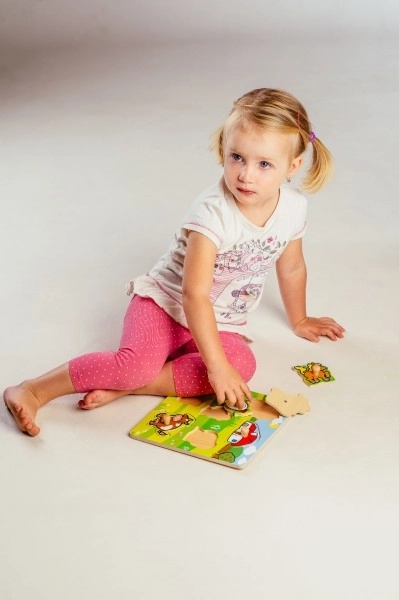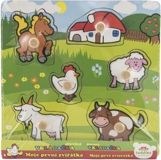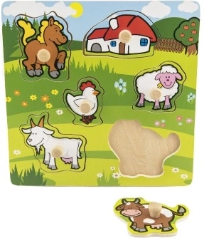 Šajā ieliktņā ir 5 krāsaini dzīvnieciņi – zirgs, kaza, aita, vista un govs – kurus ir viegli satvert, pateicoties mazajiem koka rokturiem. Katram gabaliņam ir sava vieta uz koka pamatnes, kas palīdz bērniem apgūt pareizu katra gabaliņa novietošanu.