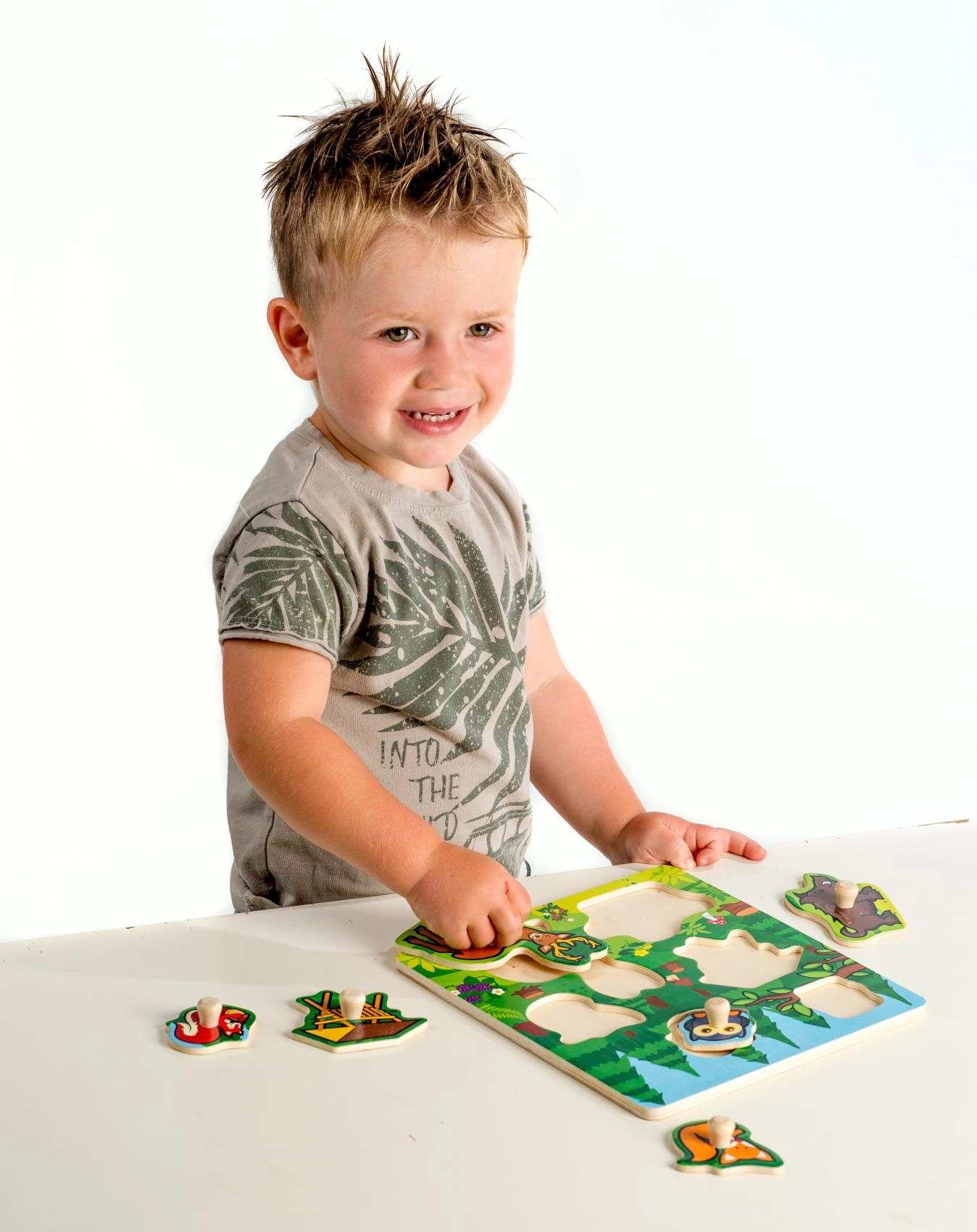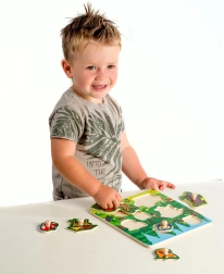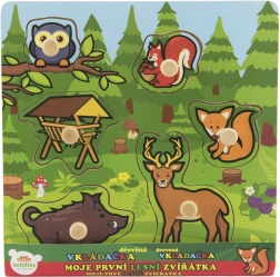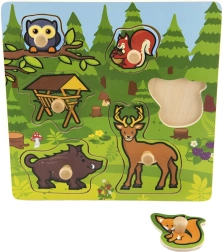 Meža motīvi, piemēram, pūce, vāvere, mežacūka un briedis, rotaļīgā veidā motivē izzināt. Koka pamatne ar rāmīšiem notur katru gabaliņu savā vietā un atvieglo pareizu saskaņošanu pēc formas un attēla.