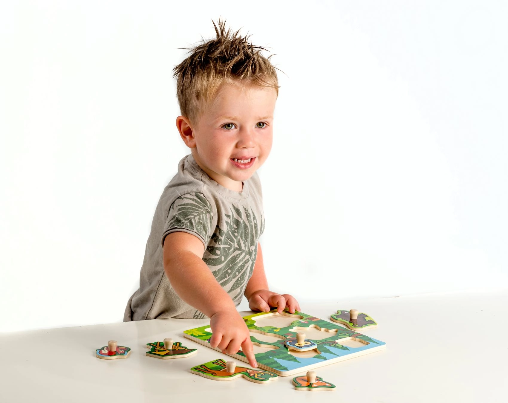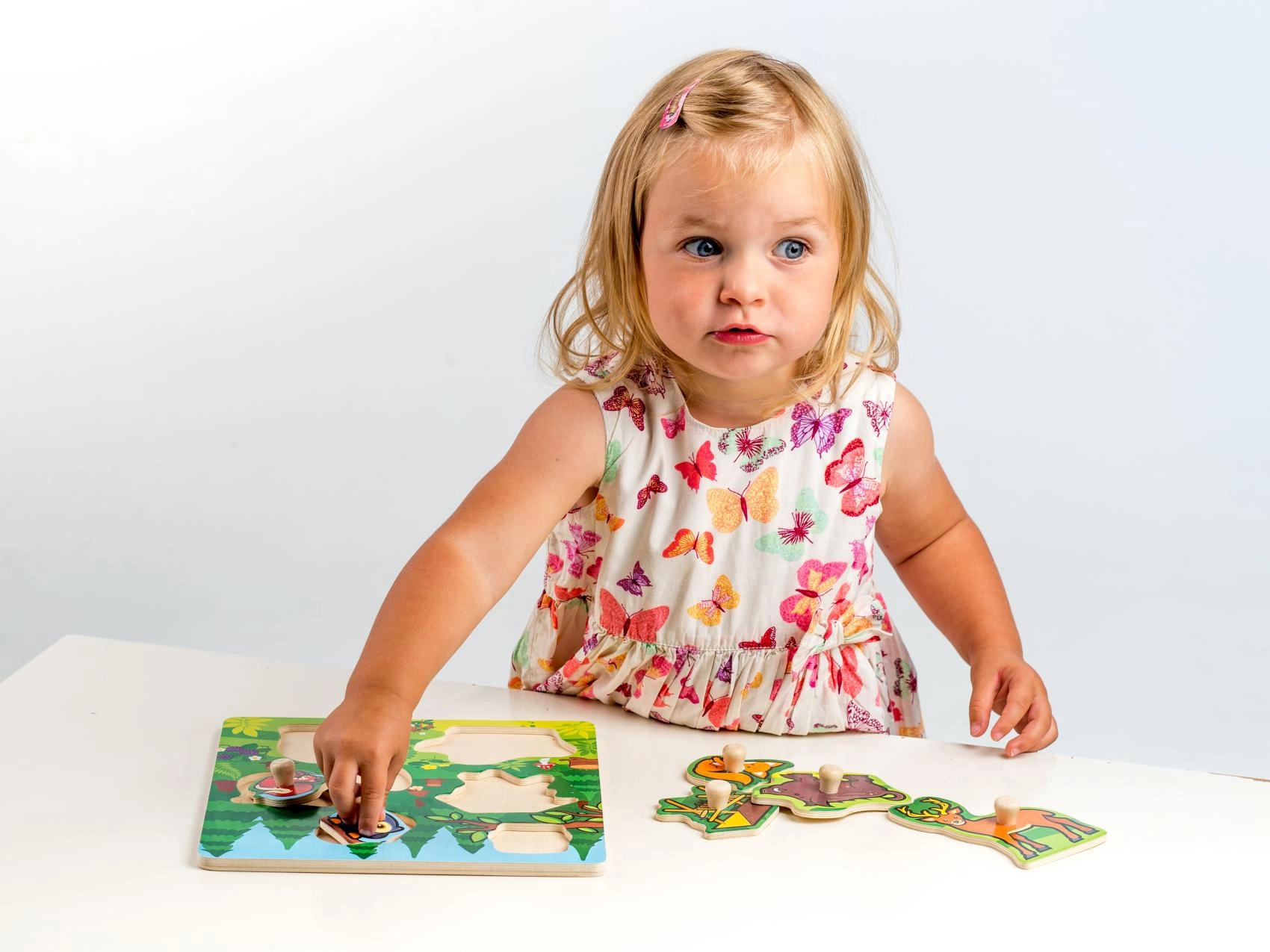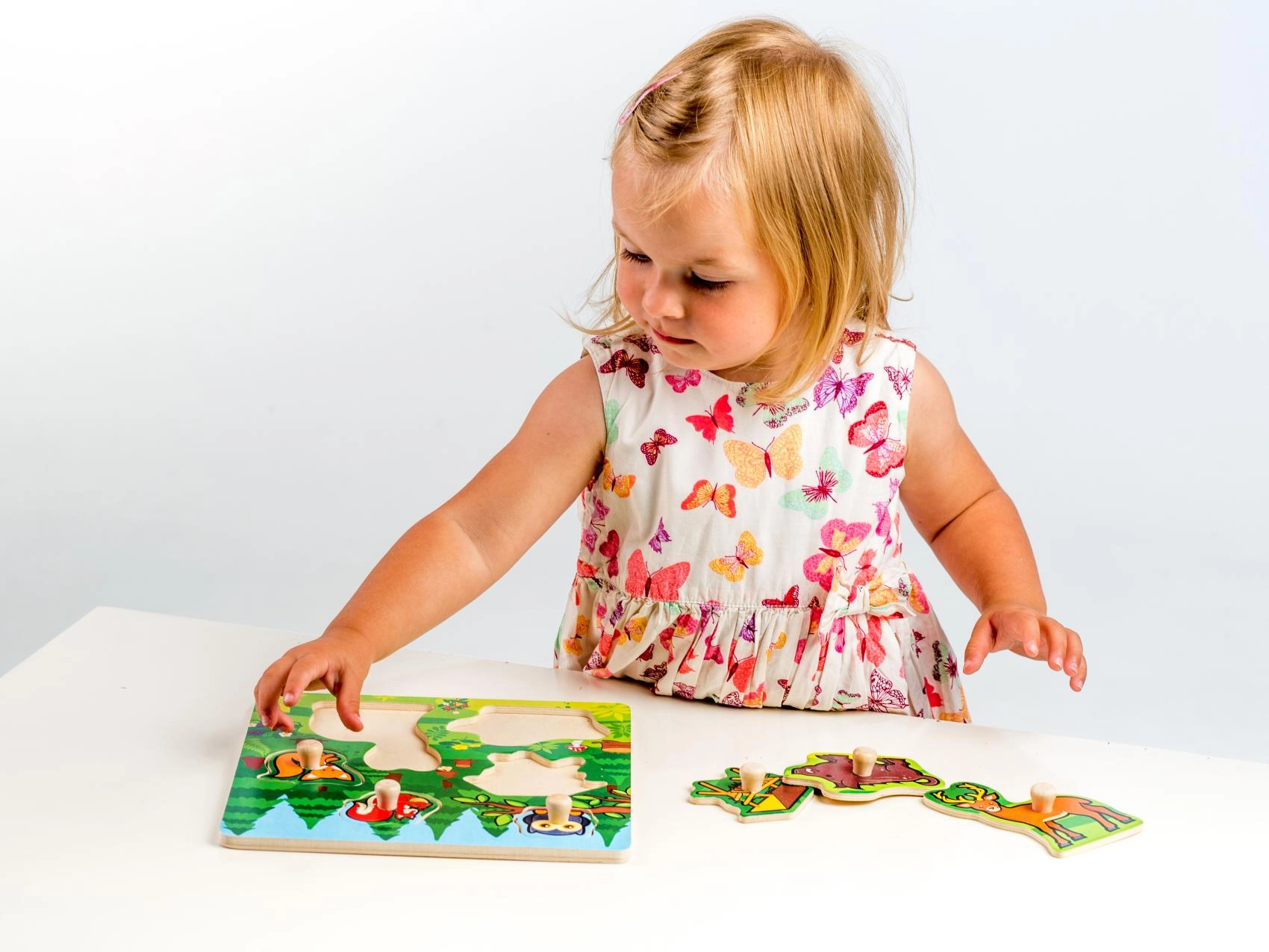 Atklājiet pirmās puzles burvību pašiem mazākajiem: koka ieliktnis ar rokturiem un sešiem meža dzīvniekiem. Attīsta sīko motoriku, acu–roku koordināciju un formu atpazīšanu. Izturīga koka pamatne ar rāmīšiem palīdz, lai gabaliņi vienmēr viegli ieguļ savā vietā.