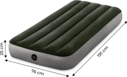 Izbaudiet komfortu ceļā vai mājās ar šo Intex uzpūšamo matraci. Ar izmēriem 191x76x25 cm tas ir ideāli piemērots bērniem vai vienai personai ceļojumos, gan viesnīcā, gan kempingā. Izgatavots no izturīga PVC un pārklāts ar patīkamu, ūdeni atgrūdošu velūru.