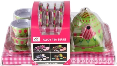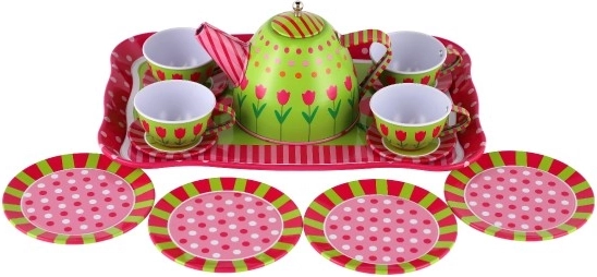 Sarīkojiet burvīgu tējas ballīti! Šis kvalitatīvais bērnu metāla tējas serviss ietver 14 trauku gabalus servēšanai un lomu spēlēm. Pateicoties izturīgajam skārda izpildījumam, krāsainajiem rakstiem un praktiskajai paplātei, tas ir ideāli piemērots kopīgai spēlei bērniem no 3 gadu vecuma. Brīdinājums: nav paredzēts reālai lietošanai ar dzērieniem.