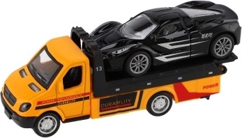 Šis realistiski izstrādātais evakuators ar uzkrautu sporta mašīnīti papildinās bērna autoparku ar iemīļotu darba auto. Pateicoties pull-back inerces mehānismam, pietiek piespiest, atlaist un vērot darbību – lieliski ainiņām no pilsētas, ceļa vai autoservisa.