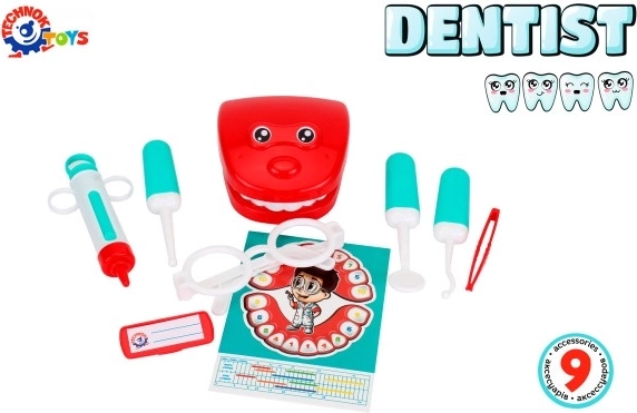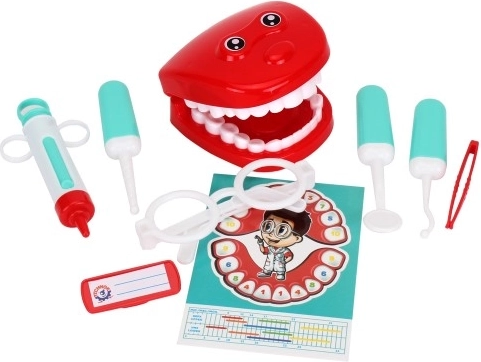 Šis krāsainais zobārsta komplekts ir ideāli piemērots mazajiem zinātkārajiem dakteriem. Tajā atradīsiet visu, kas nepieciešams jautrai rotaļlietu pārbaudei: žokļa modeli, spogulīti, zondi, urbīti, šļirci, pinceti, brilles un nozīmīti. Komplektā ir arī pārskatāma zobu numerācijas shēma, ar kuras palīdzību bērni viegli apgūs zobu kopšanas pamatus.