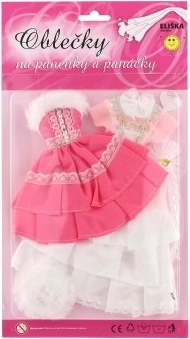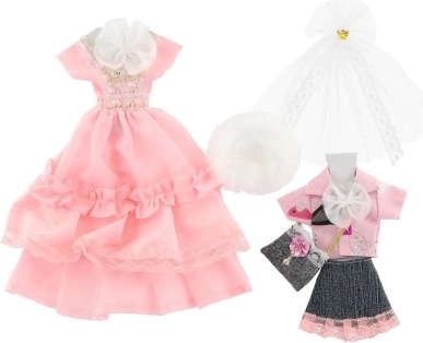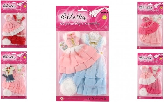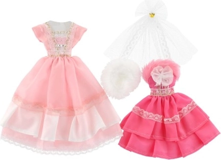 Divi atšķirīgi kleitu komplekti, katrs ar savām detaļām, kas piešķir katrai lellei izteiksmīgu izskatu.
