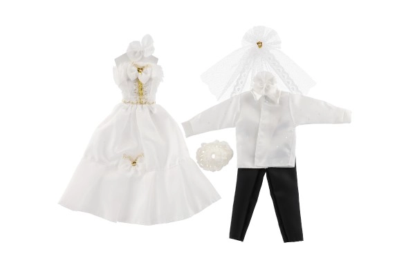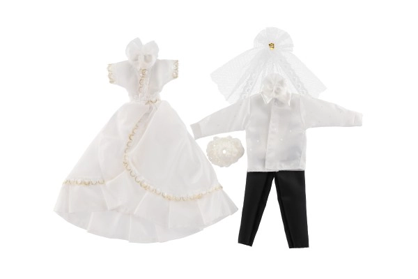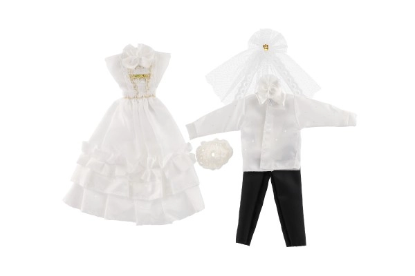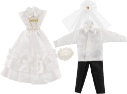 Šis komplekts piedāvā reālistiskus kāzu tērpus ar mežģīņu un rievotu detaļu akcentiem, kas piešķir īstu kāzu noskaņu.