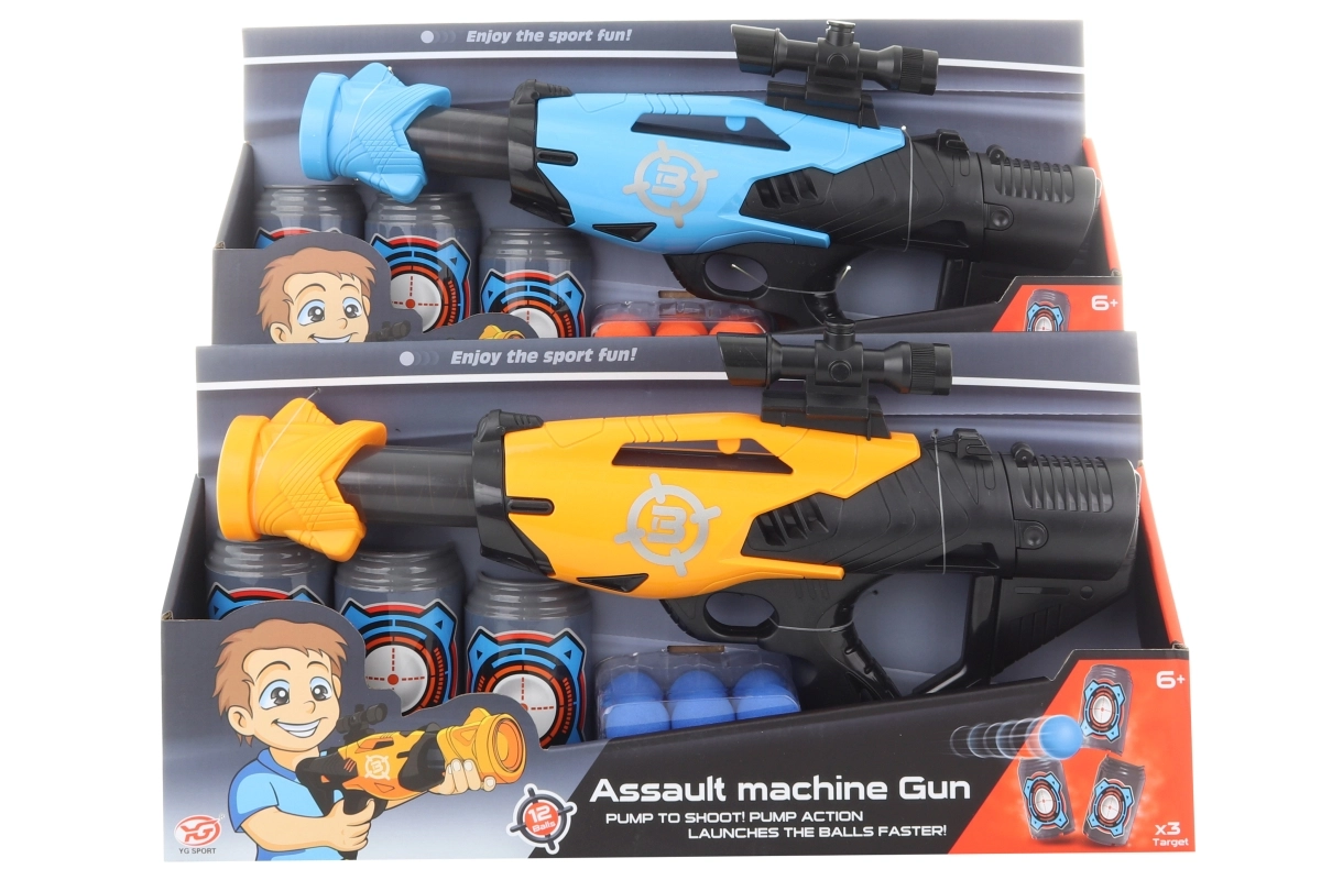 Šī plastmasas putu bumbiņu pistole ir ideāli piemērota bērniem, kuri mīl aktīvas spēles. Komplektā ir trīs plastmasas bundžas ar mērķi un divpadsmit bumbiņas, kas ļauj veidot un izveidot dažādus izaicinājumus. Pistole ir izstrādāta tā, lai būtu viegla un viegli lietojama.