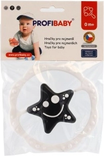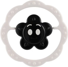 Teksturētās malas darbojas kā maigs košļājamais elements, nomierinot kairinātas smaganas. Kontrastējošs zvaigznes/zieda motīvs vidū piesaista uzmanību arī ļoti maziem bērniem, kuri tikai mācās fokusēt skatienu. Rotaļlieta izgatavota no kvalitatīvas plastmasas un ir piemērota ikdienas lietošanai mājās un ceļā.