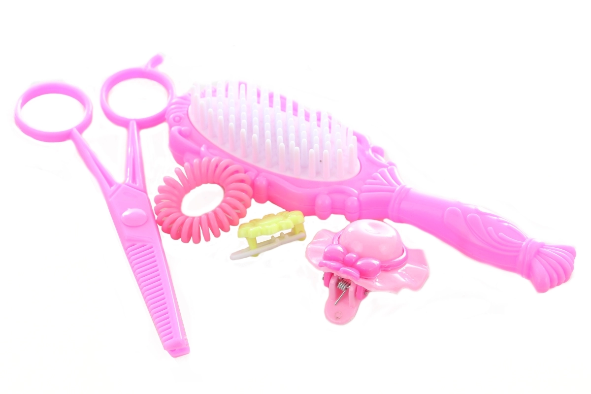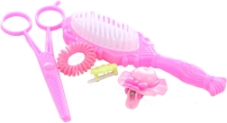 Komplektā ir ķemmīte, rotaļu šķērītes, spirālītes, gumijas un sprādzītes – viss izmēros pielāgots bērniem drošai un aizraujošai spēlei.