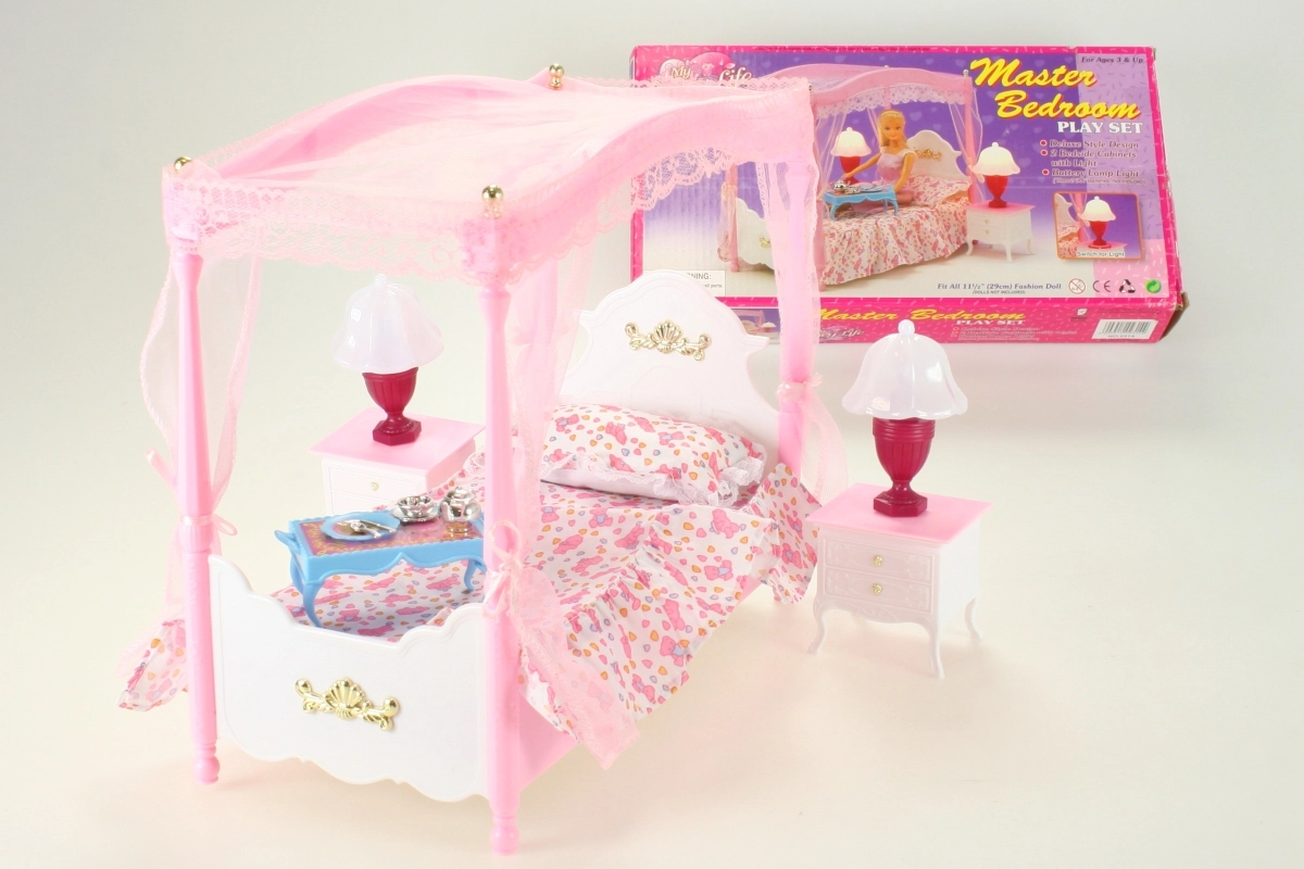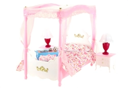 Palutiniet lelles ar greznu miegu eleganti noformētā GLORIE baldahīna gultā. Komplektā ietilpst gulta ar pārklāju un spilventiņu, divi naktsgaldiņi un divas lampiņas, kas, pagriežot cilindru, ieslēdzas. Ideāli radošai spēlei un stilīgām leļļu mājiņām.