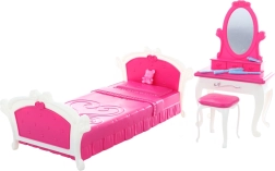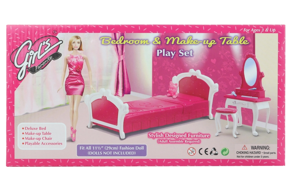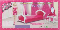 Stilīgs komplekts leļļu bērnistabai ar plastmasas gultu un kosmētikas galdiņu ar piederumiem. Ideāli piemērots radošai spēlei no 3 gadu vecuma. Komplektā ir ķemme, krēms, birste un taburete. Lelle nav iekļauta komplektā.