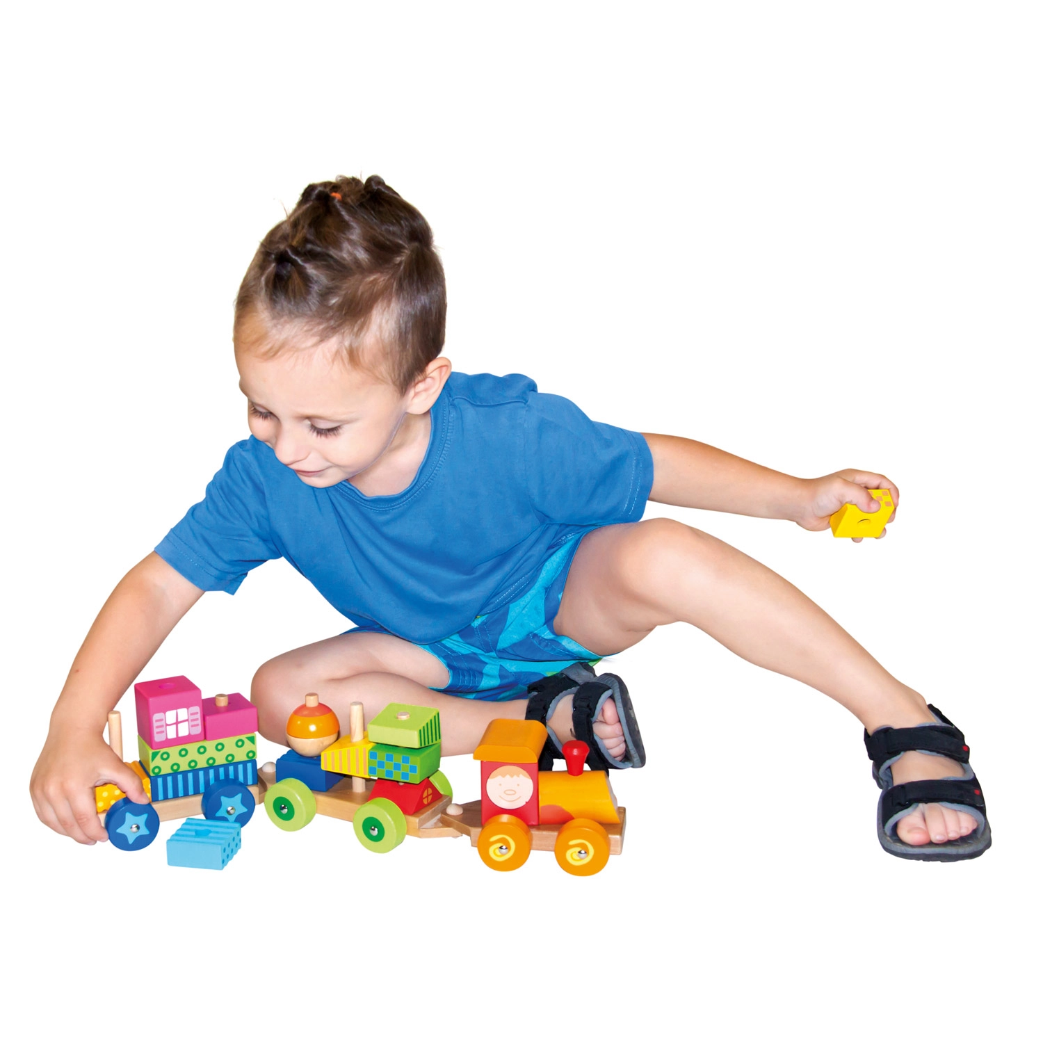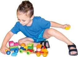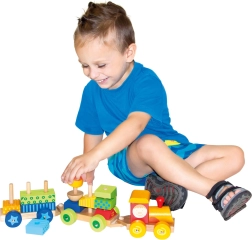 Multifunkcionālais koka vilcieniņš ir ne tikai velkamā rotaļlieta, bet arī konstruktors, kas bērniem ļauj attīstīt radošumu. Komplektā ir trīs šasijas un 18 dažādi klucīši, kurus var salikt pēc savas fantāzijas.
