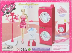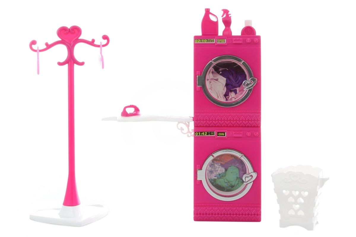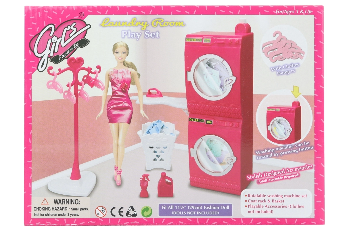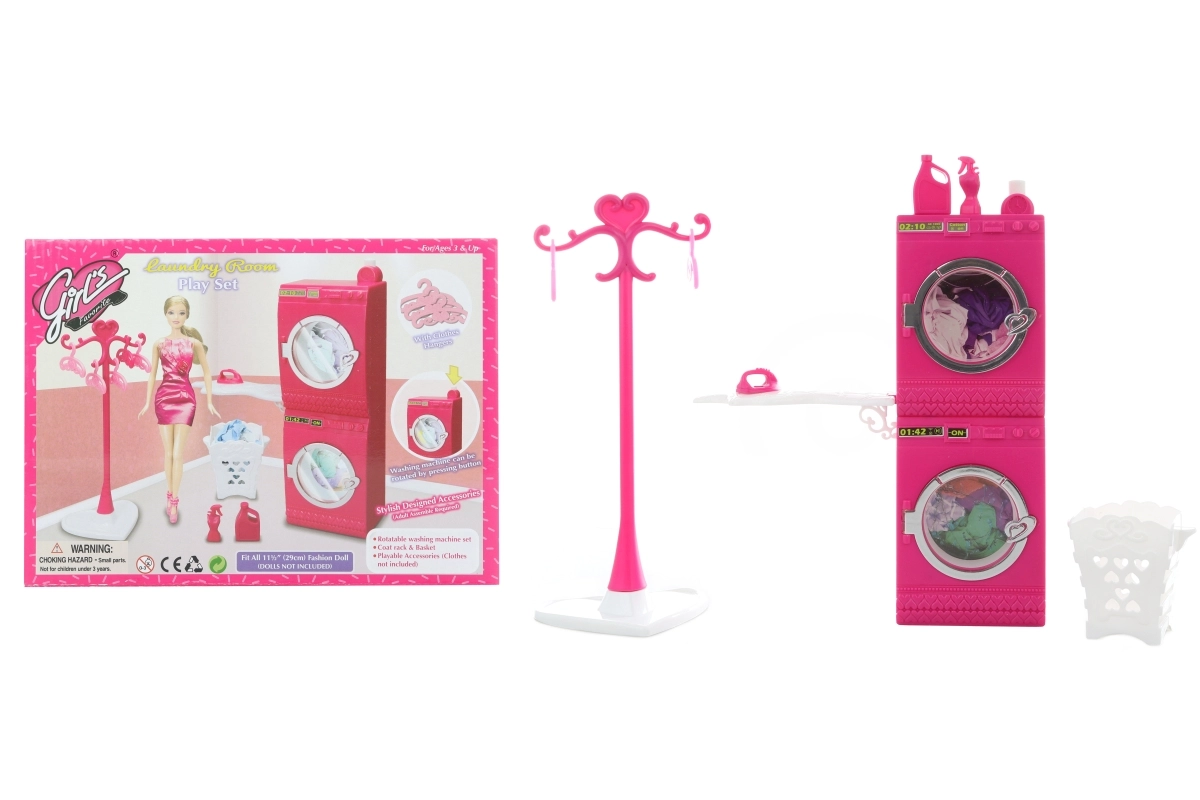 Glorie veļas telpas komplekts bērniem piedāvā aizraujošu un izglītojošu mājas spēli. Funkcionālais elements – veļas mašīna, kas pēc pogas nospiešanas tiešām griežas – attīsta iztēli un sīko motoriku. Pateicoties žāvētājam, gludināmajam dēlim un citiem piederumiem, bērni var atdarināt visu leļļu veļas mazgāšanas un gludināšanas procesu.