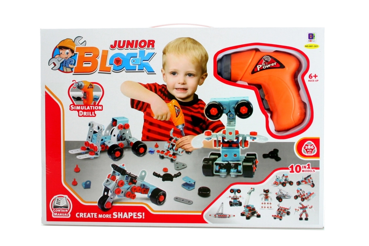 Attīstiet radošumu un sīko motoriku ar universālo Junior Block konstruktoru. Komplektā ir 286 detaļas, tostarp simulēta akumulatora skrūvmašīna, un tas ļauj bērniem no 6 gadu vecuma būvēt līdz pat 10 dažādiem modeļiem – transportlīdzekļus, robotus un citas konstrukcijas. Praktisks iepakojums (aptuveni 41 × 29 × 6 cm) un viegla skrūvēšana ar plastmasas skrūvēm un uzgriežņiem nodrošinās stundām ilgu izklaidi. Skrūvmašīna darbojas ar 2× AA baterijām (nav iekļautas).