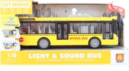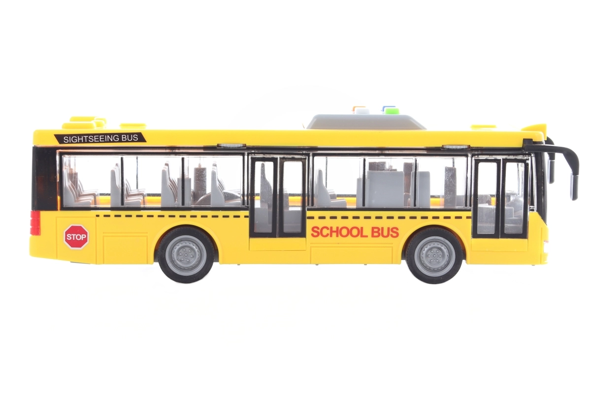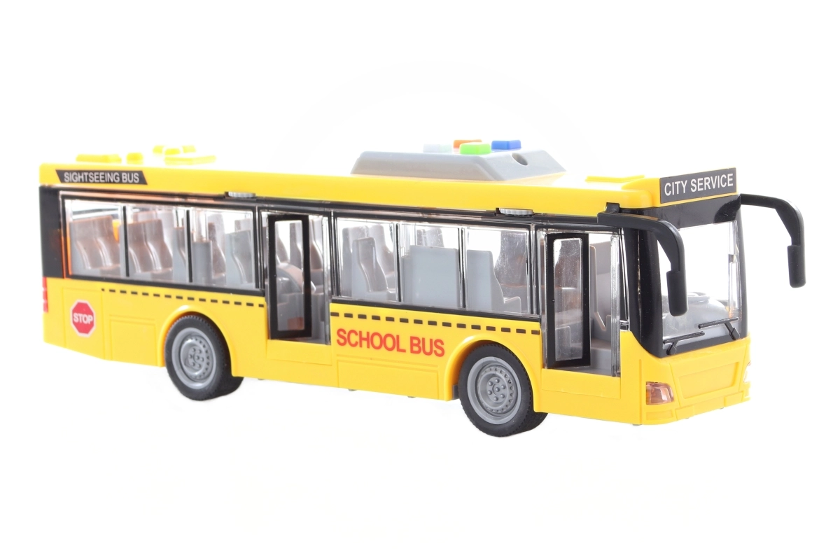 Autobusam ir caurspīdīgi logi, redzami sēdekļi un detalizēti uzraksti “SCHOOL BUS” un “CITY SERVICE”, kas pastiprina īstu izskatu. Tas ir ideāls bērniem no 3 gadu vecuma, un, pateicoties iekļautajām AG13 baterijām, ir gatavs braukšanai uzreiz pēc izpakošanas.
