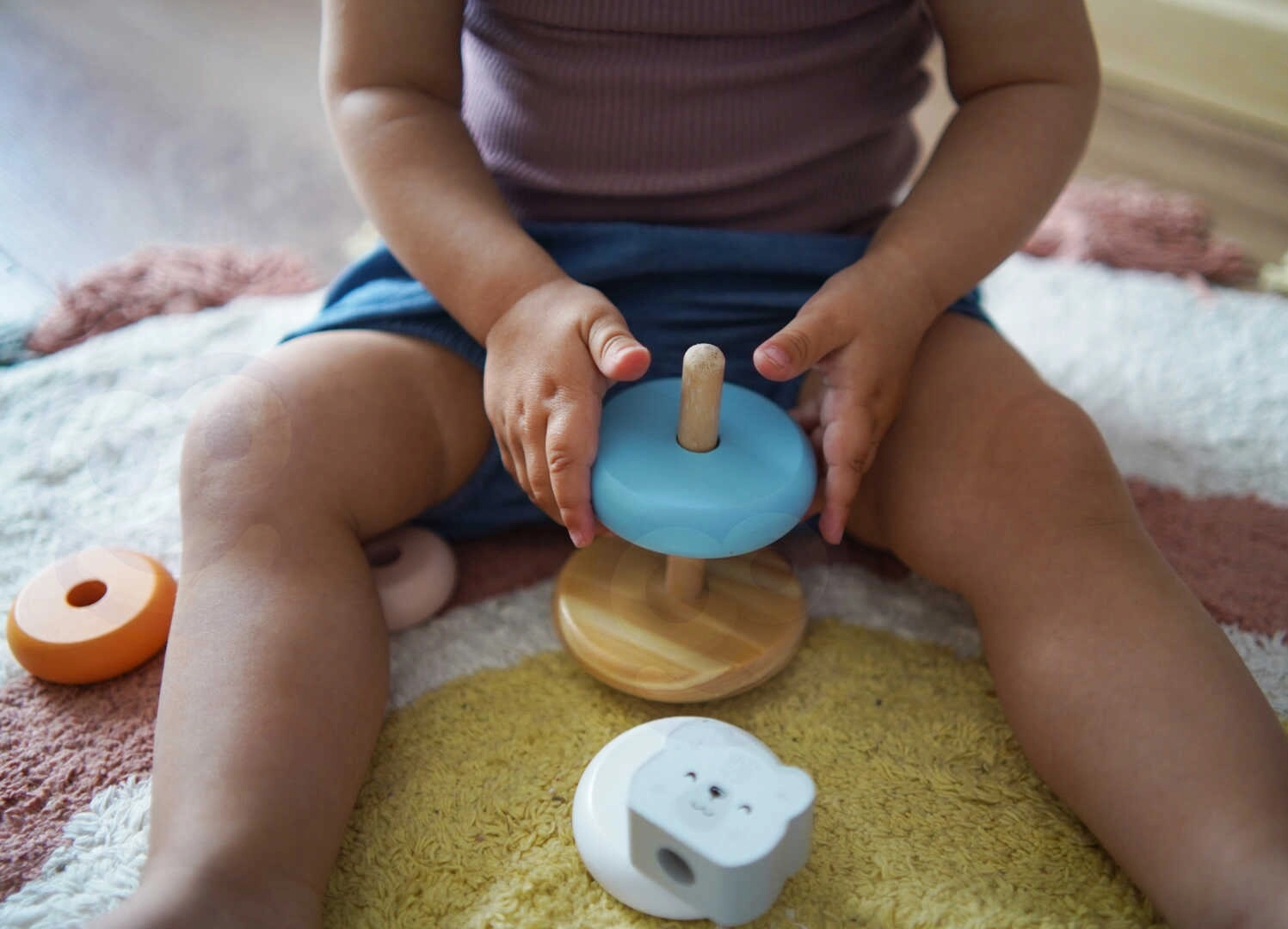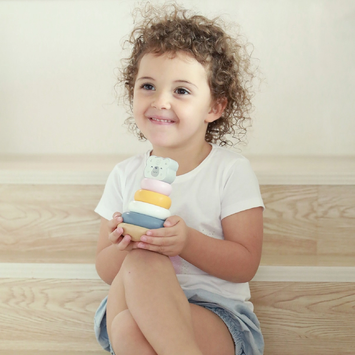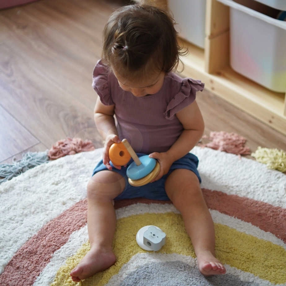 Komplektā ir seši pasteļkrāsaini gredzeni, tostarp galvenais gredzens ar lāča galvu, kas attīsta vizuālās un motoriskās prasmes.
