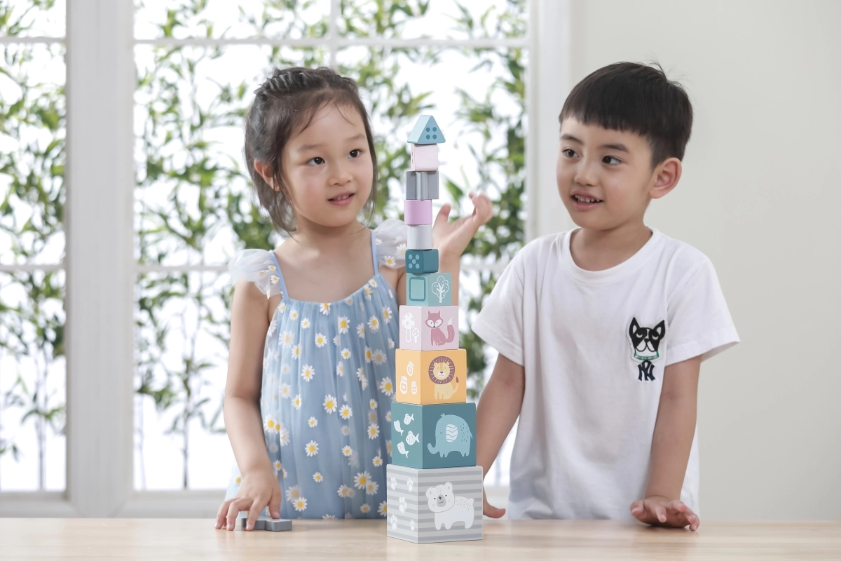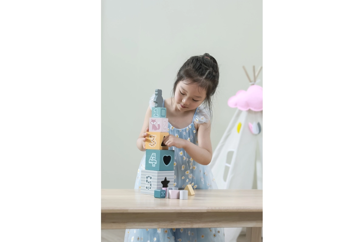 Torņa kluču komplekts piedāvā interaktīvu veidu, kā attīstīt bērnu iztēli un loģisko domāšanu.