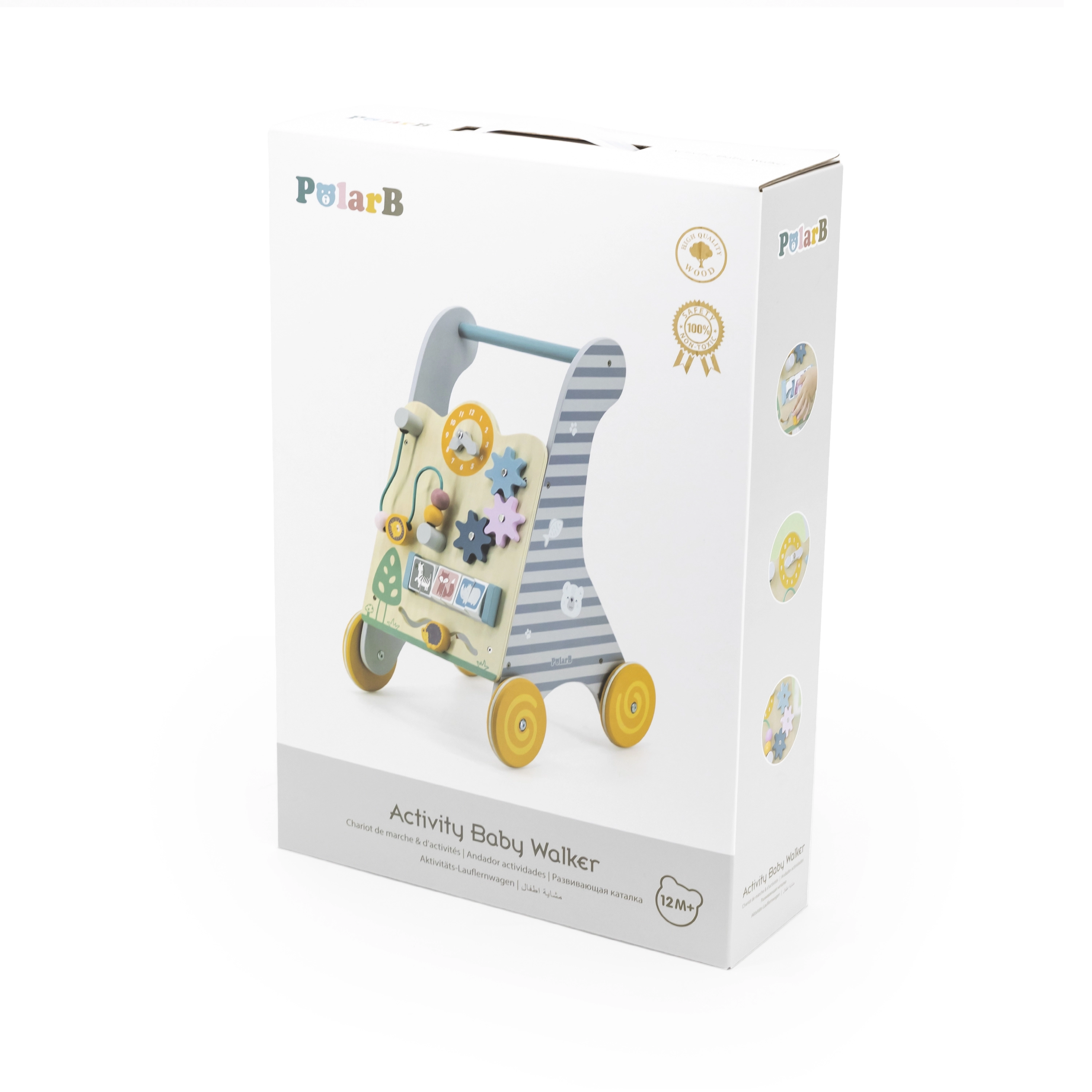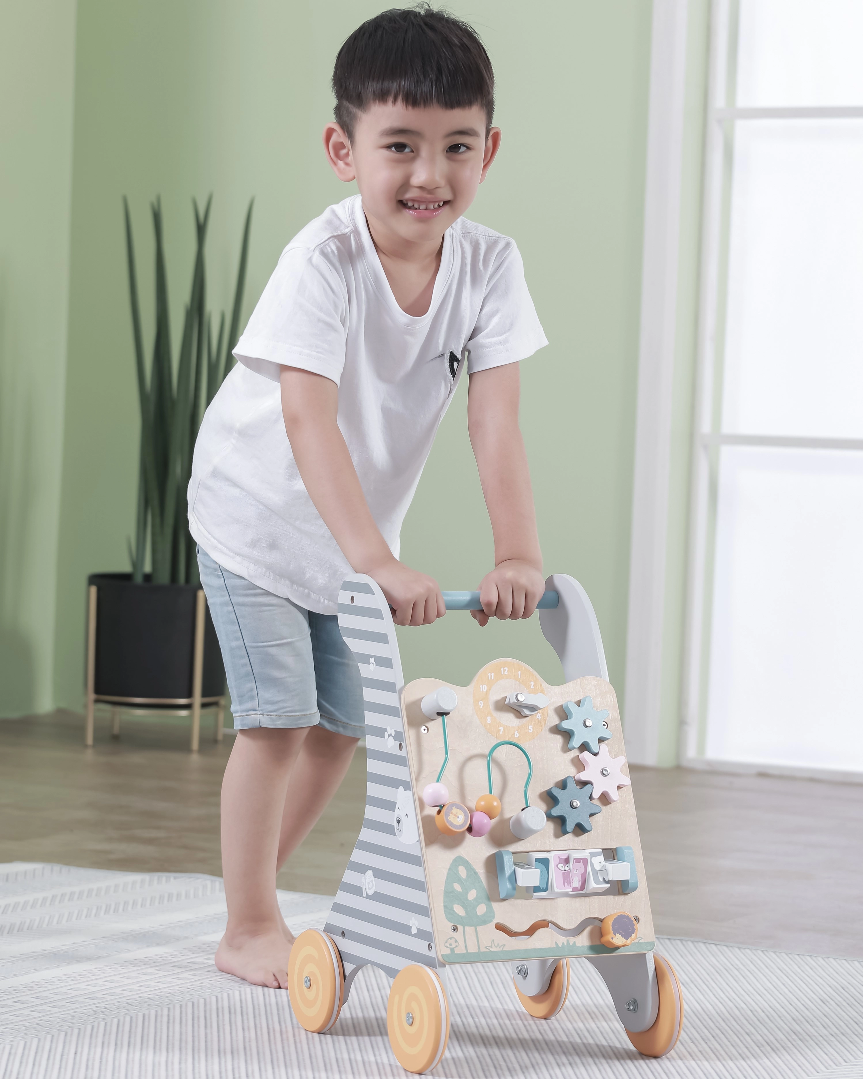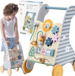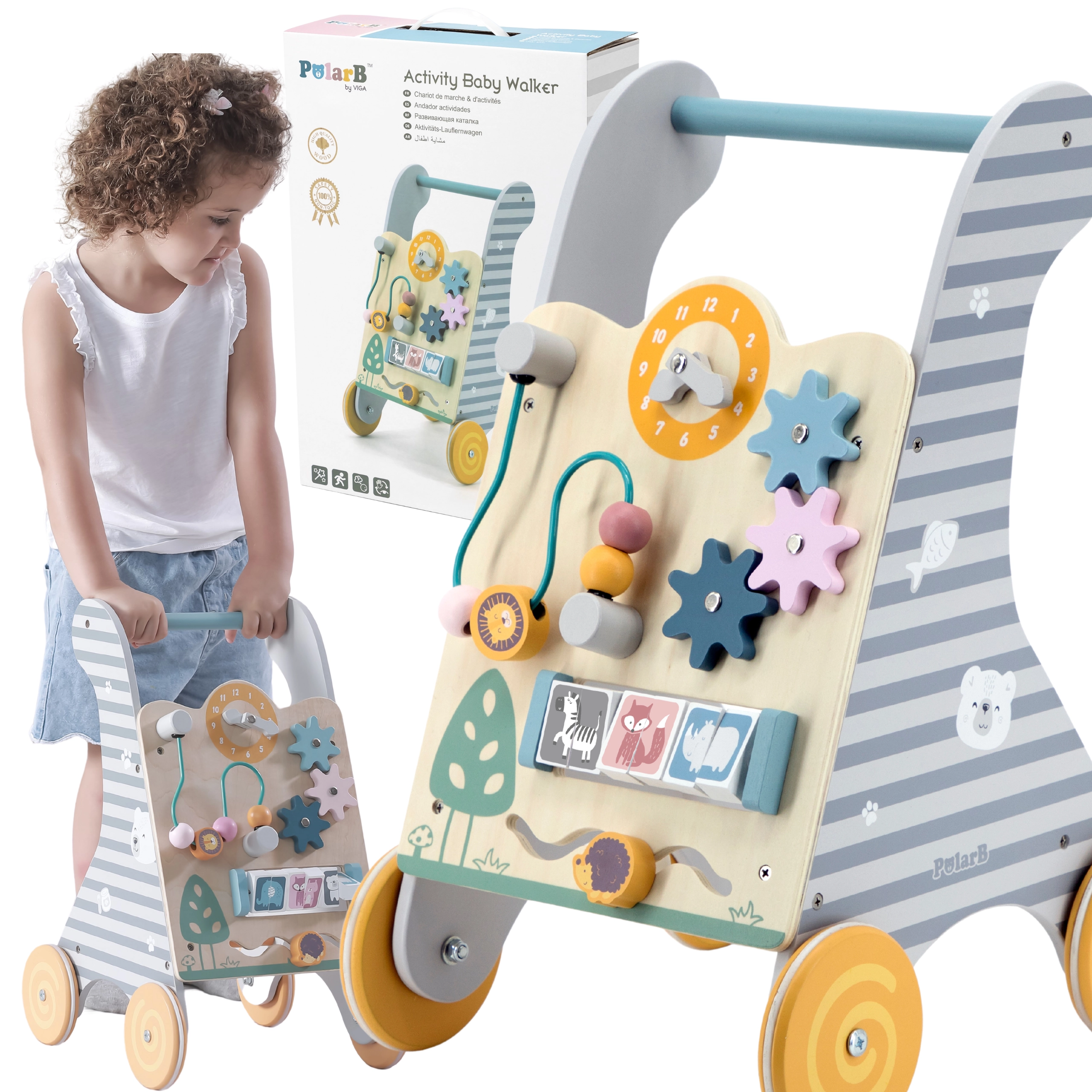 Koka izglītojošais staigulis no Viga Toys ir lielisks rīks motorikas un kognitīvo prasmju attīstīšanai bērniem no 18 mēnešu vecuma. Multifunkcionālais dizains apvieno stabilu staiguli un interaktīvu mācību paneli, kas māca bērniem atpazīt formas un krāsas. Pievilcīgi elementi, piemēram, zobrati, trases ar dzīvnieciņiem un sānu paneļi, notur bērna uzmanību un nodrošina izklaidi.