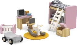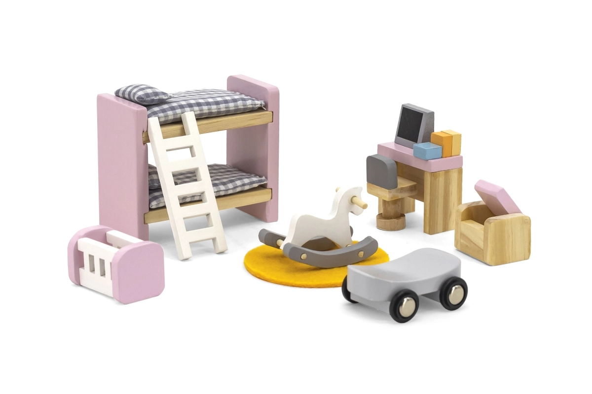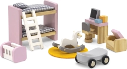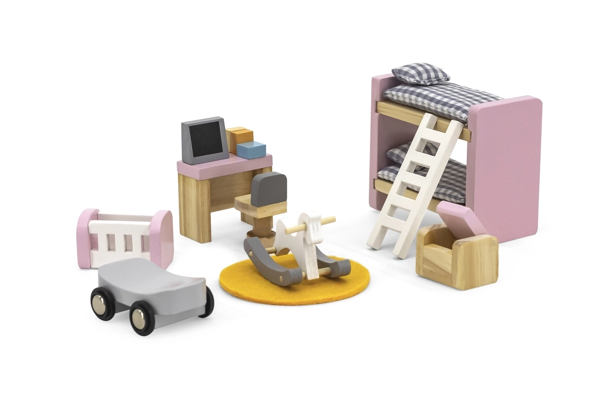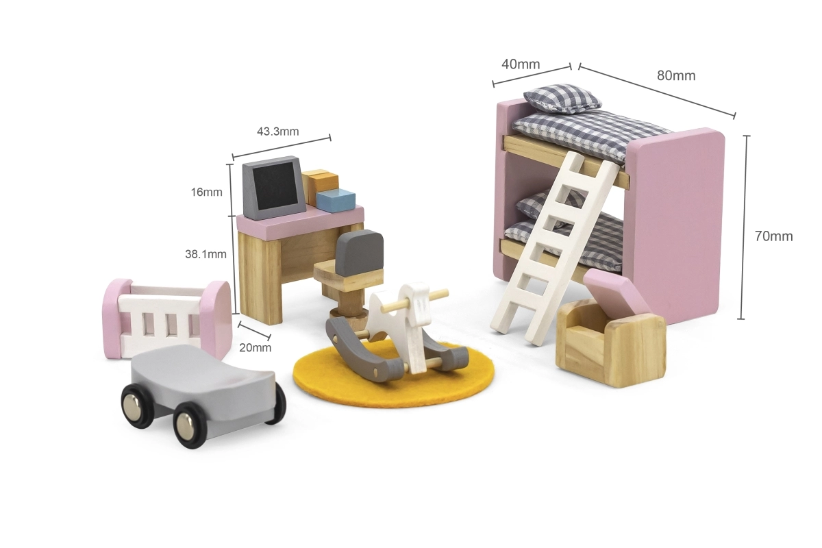 Rakstāmgalds ar “datoru” un krēsliņu, divstāvu gulta ar kāpnītēm, šūpulītis, šūpuļzirgs, braucamratiņš, pufs un paklājiņš – viss saskaņots maigos pasteļtoņos reālistiskai spēlei.