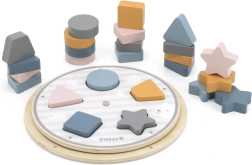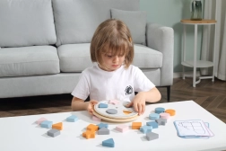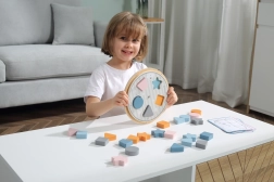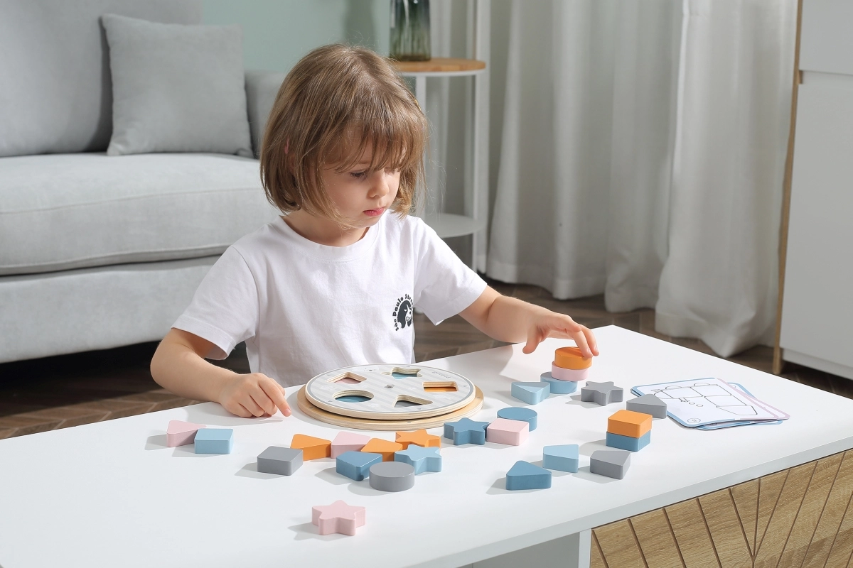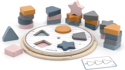 Bērni pielāgo koka detaļas izgriezumiem uz pamatnes un dabiski apgūst krāsas un pamatformas – apli, kvadrātu, trīsstūri un zvaigzni.