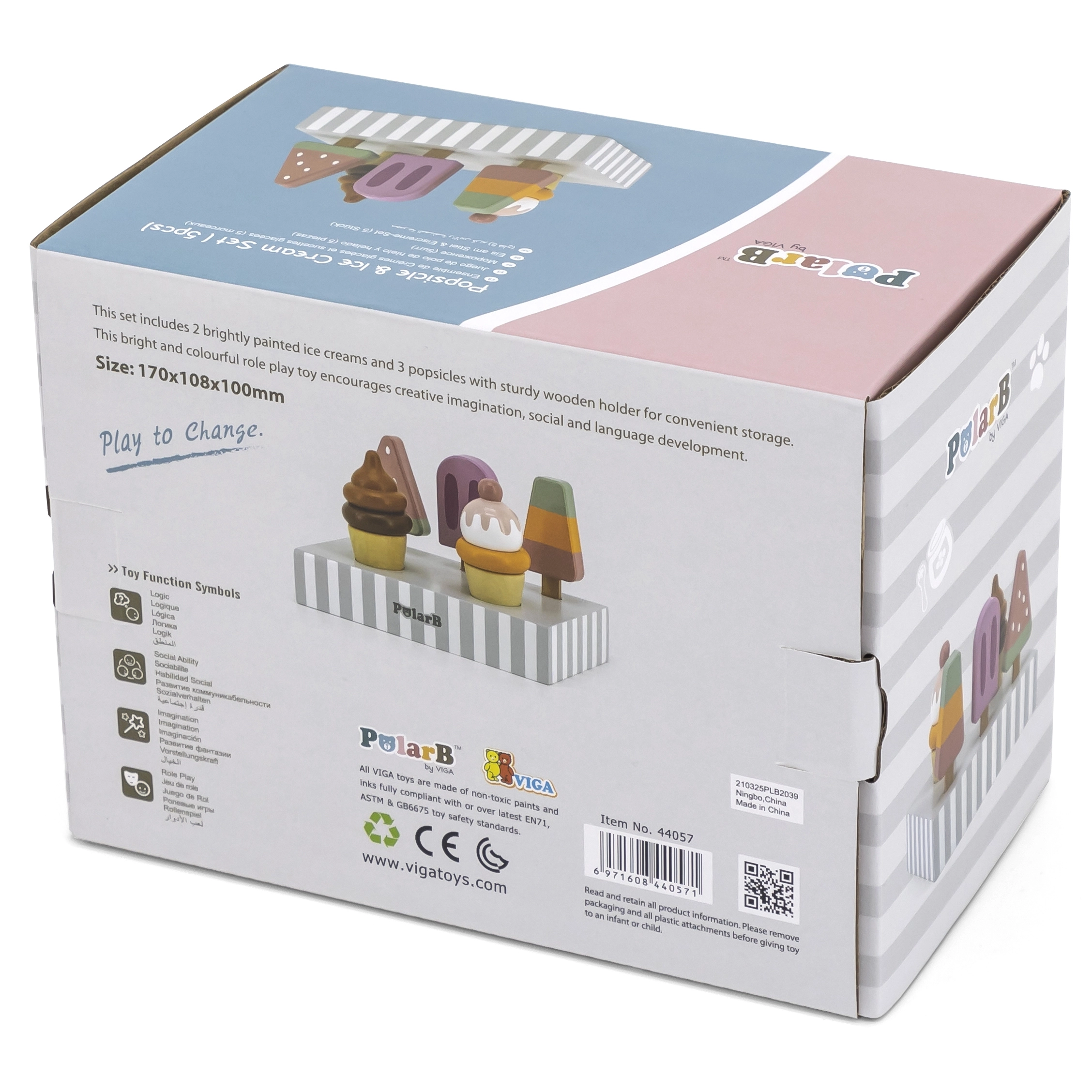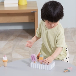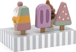 Komplekts ar 5 koka saldējumiem pievilcīgās krāsās sniedz bērniem bezgalīgu izklaidi. Saldējumi ir novietoti uz stabila koka statīva, kas kalpo gan izstādīšanai, gan pārskatāmai glabāšanai. Viss izgatavots no kvalitatīva koka un krāsots ar drošām, netoksiskām krāsām.