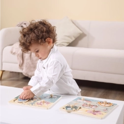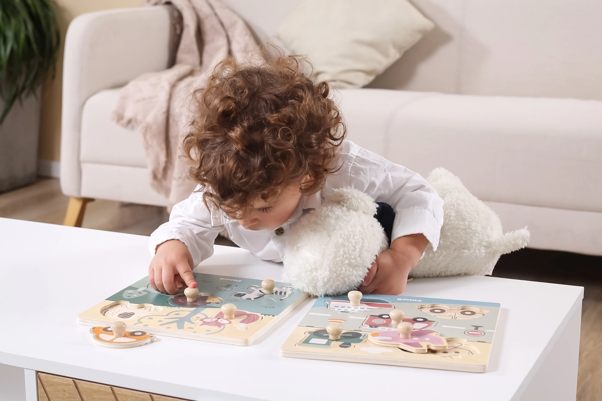 Ilustrācijas uz pamatnes norāda pareizo gabaliņu novietojumu. Bērni dabiski trenē formu, krāsu un dzīvnieku atpazīšanu.