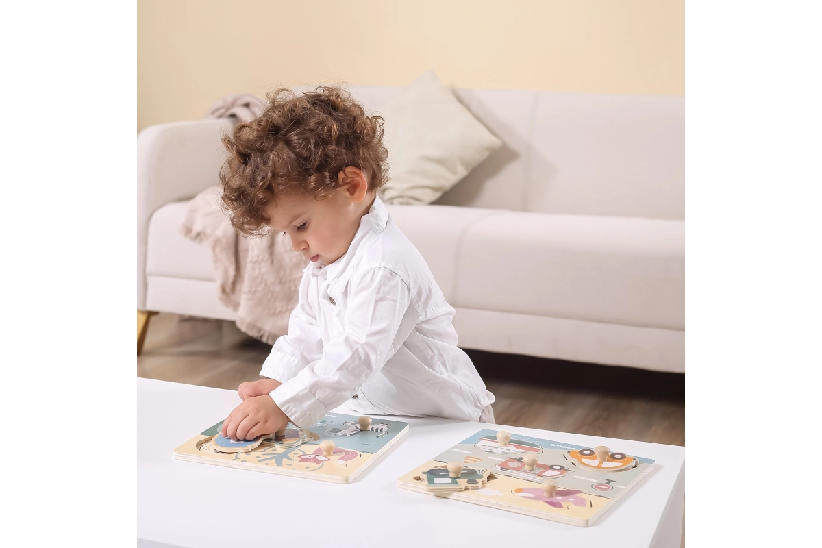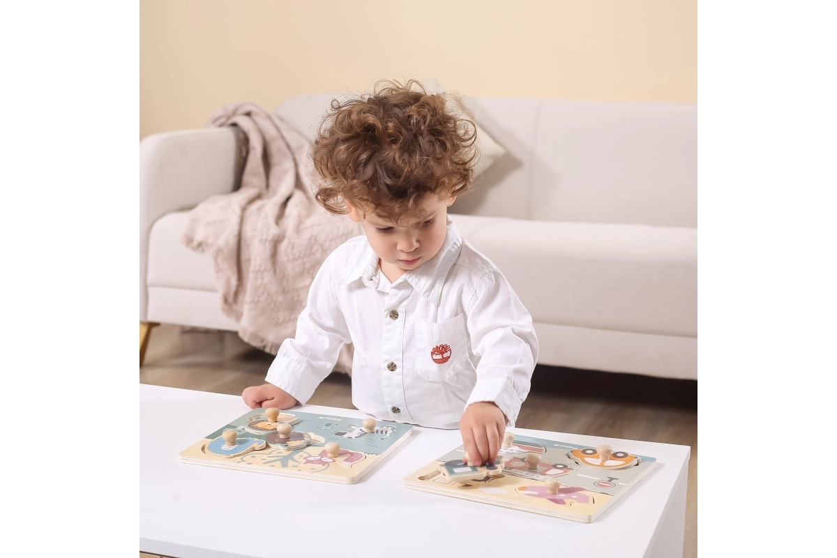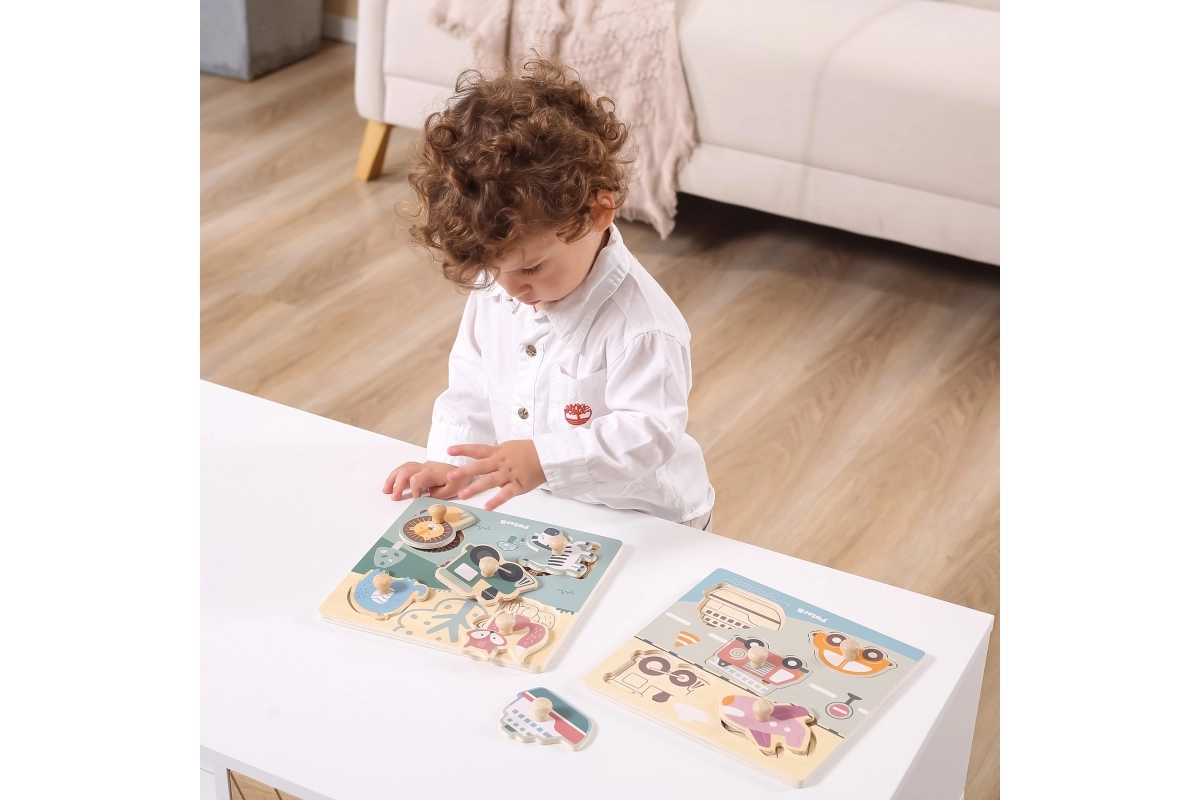 Rotaļlieta izgatavota no izturīga koka un krāsota ar netoksiskām krāsām. Tai nav asu malu, tāpēc tā ir ideāla pirmajai iepazīšanai ar puzlēm. Liekot puzli, bērni attīsta loģisko domāšanu, kognitīvās prasmes un gūst pārliecību sīkajā motorikā.