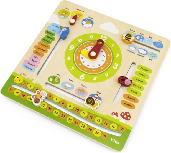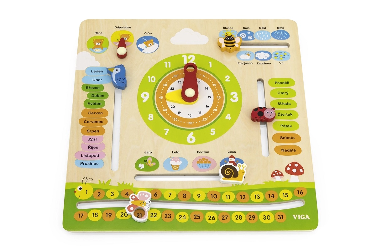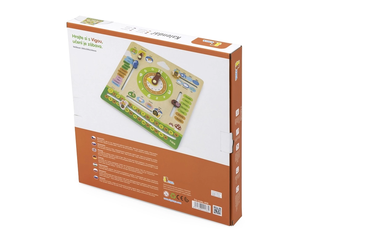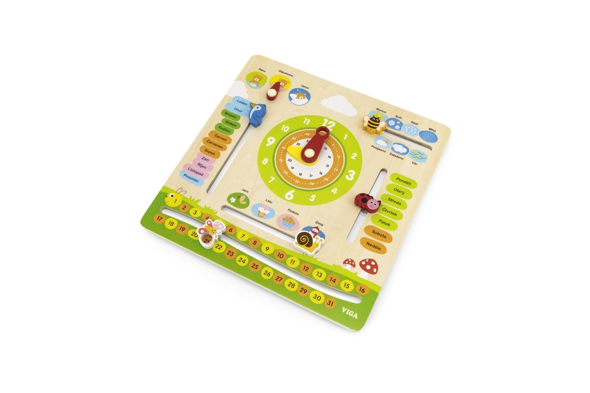 Gudrs un izklaidējošs koka VIGA kalendārs čehu valodā rotaļīgā veidā palīdz bērniem apgūt mēnešus, nedēļas dienas, laiku, gadalaikus, laikapstākļus, skaitļus un dienas daļas. Pārvietojamās rādītājbultas un slīdņi attīsta sīko motoriku un veicina patstāvīgu izpēti.