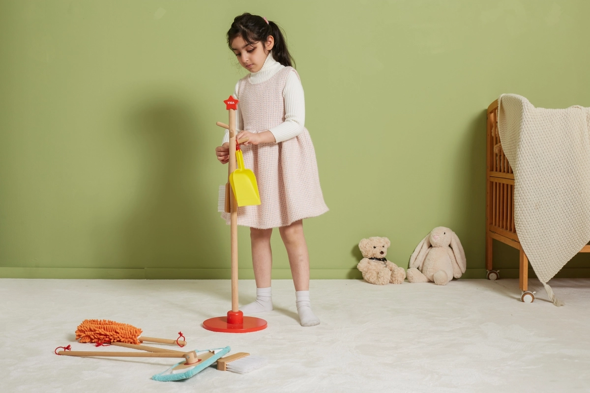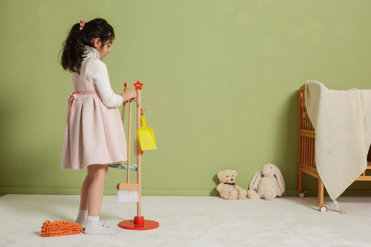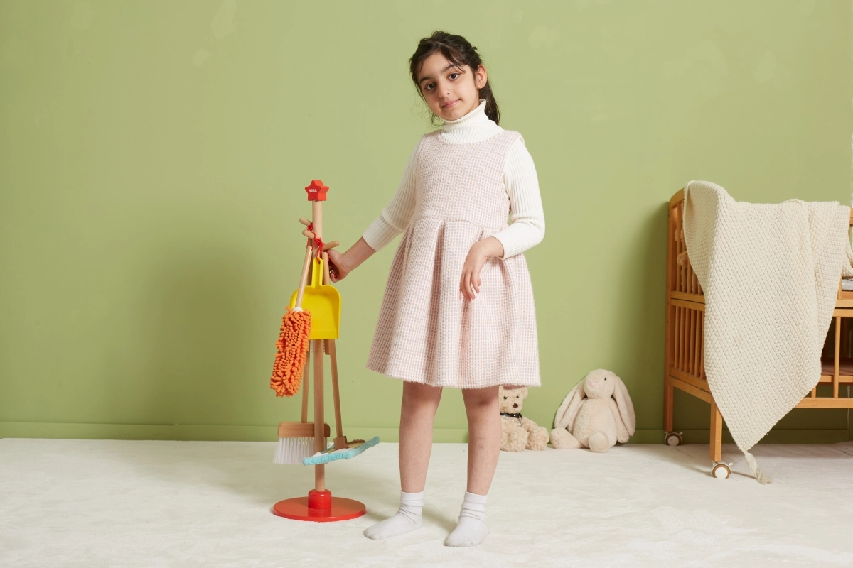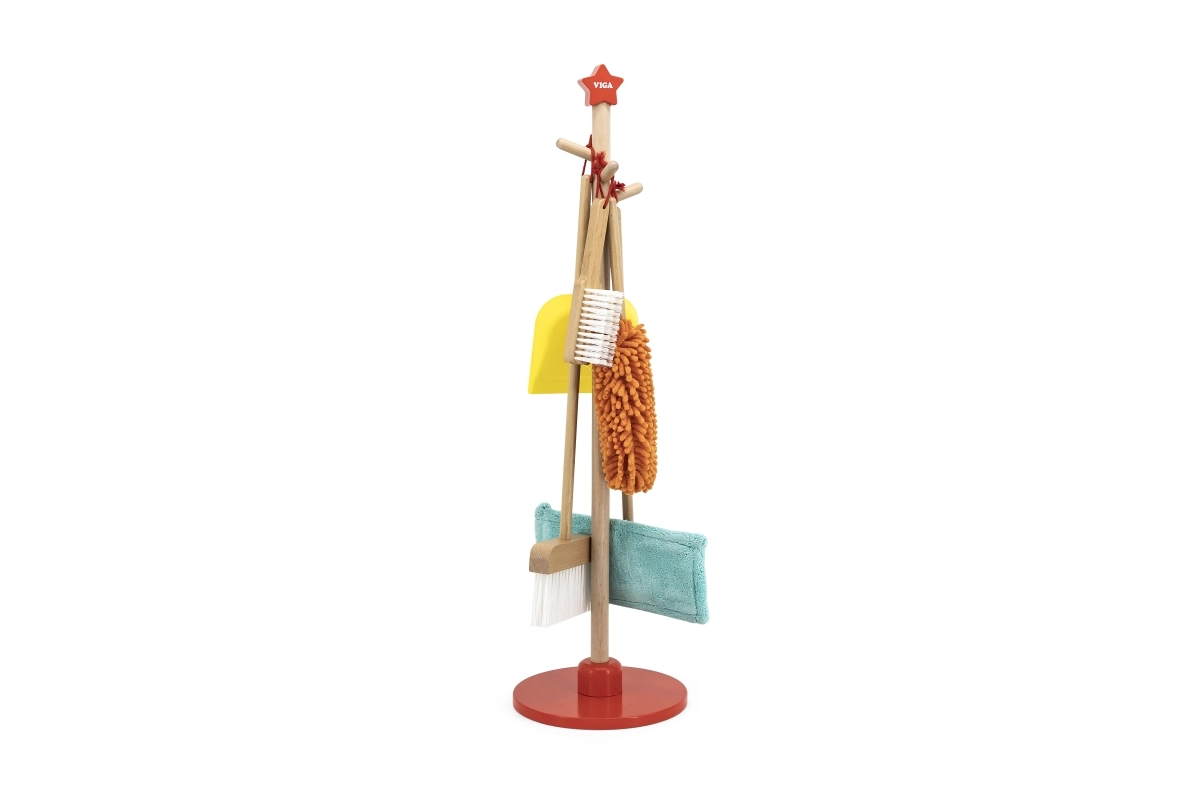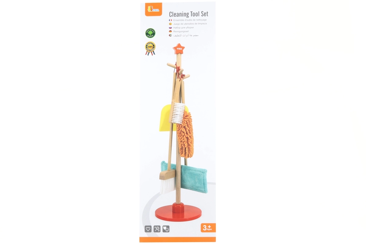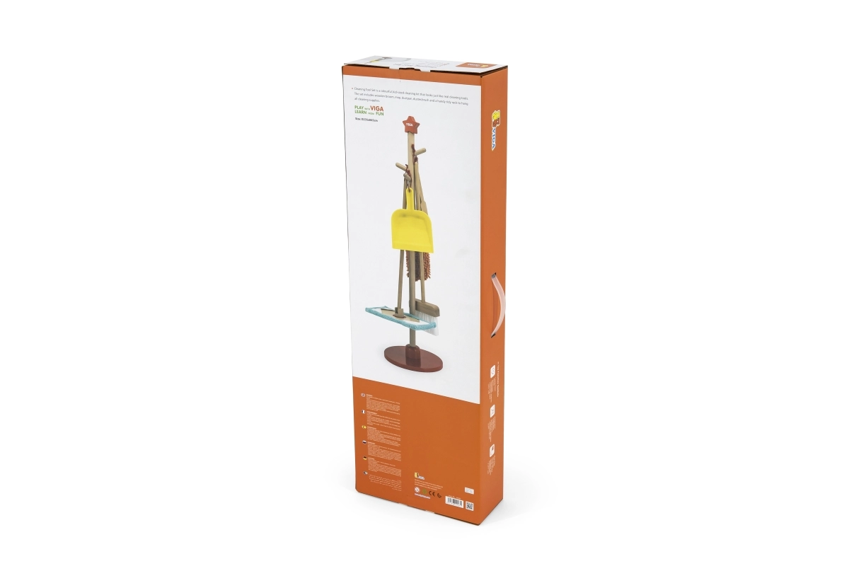 Viga koka uzkopšanas komplekts ir ideāls mazajiem palīgiem, kuri vēlas aktīvi piedalīties kārtības uzturēšanā. Pateicoties šim komplektam, kurā ietilpst slotas, mops, putekļu slota un citi rīki, bērni attīsta savas motoriskās prasmes un rotaļājoties apgūst atbildību.