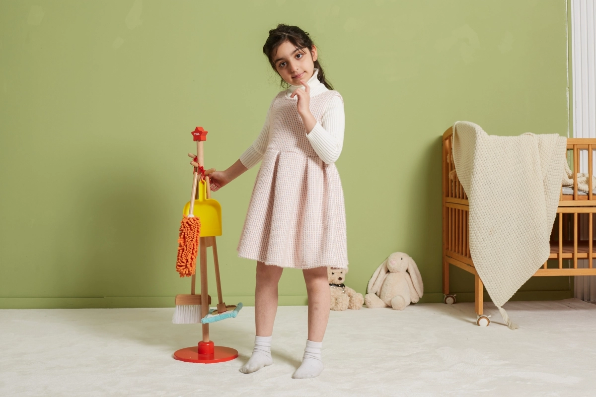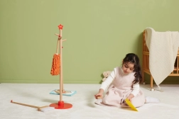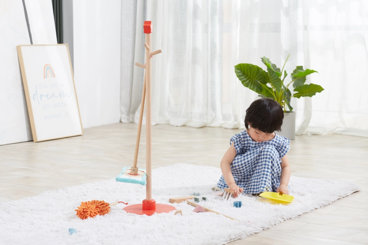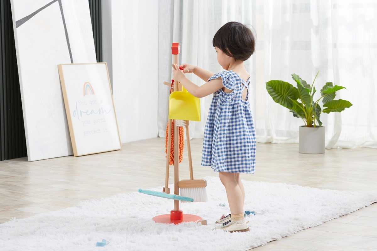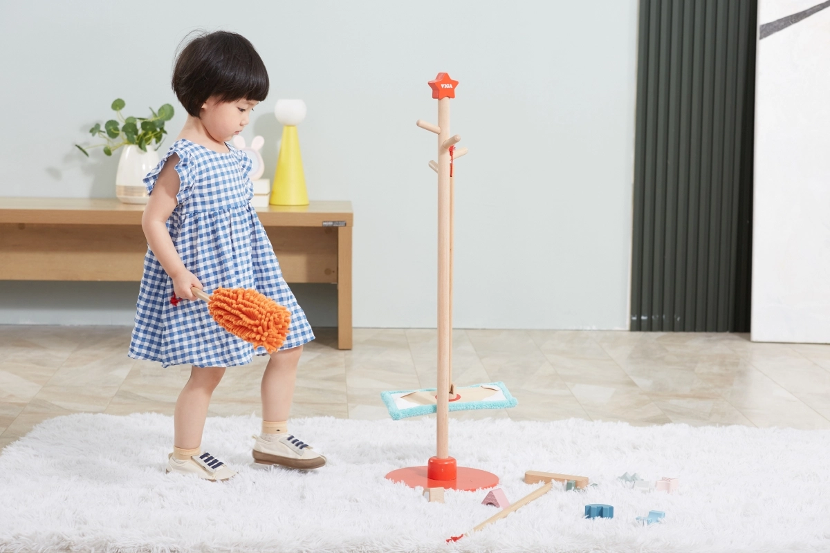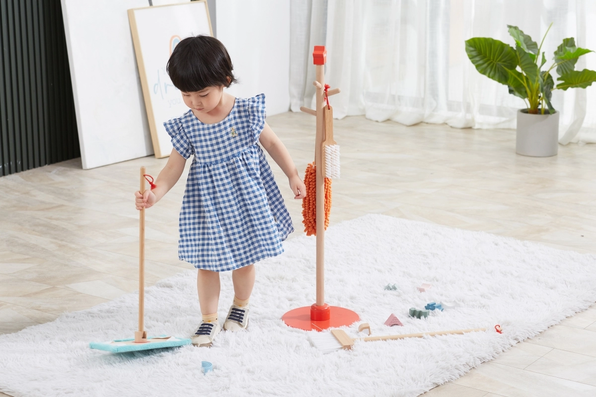 Viga koka uzkopšanas komplekts ir ideāls mazajiem palīgiem, kuri vēlas aktīvi piedalīties kārtības uzturēšanā. Pateicoties šim komplektam, kurā ietilpst slotas, mops, putekļu slota un citi rīki, bērni attīsta savas motoriskās prasmes un rotaļājoties apgūst atbildību.