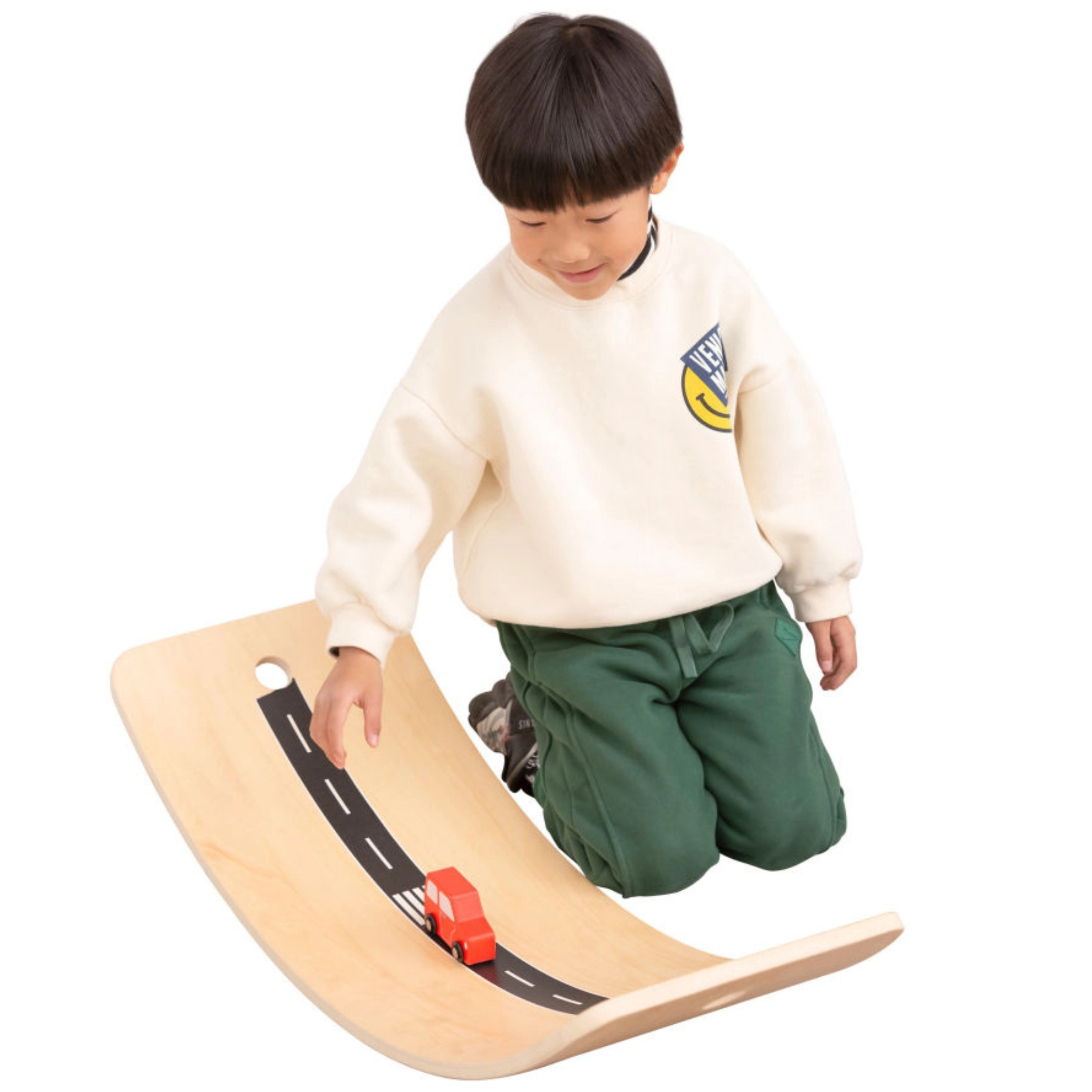 Pateicoties pievienotajai virvei ar koka rokturiem, bērni var dēli vilkt, sēdēt uz tā un kustēties. Trīs pašlīmējošas joslas pārvērtīs virsmu par auto ceļu, tāpēc dēlis kļūst arī par radošu spēļu elementu – rampu, tiltu, slidkalniņu vai sacīkšu trasi. Dēlis augs līdzi bērnam no pirmsskolas vecuma, un, pateicoties lielajai nestspējai, to izmantos arī vecākie brāļi un māsas.