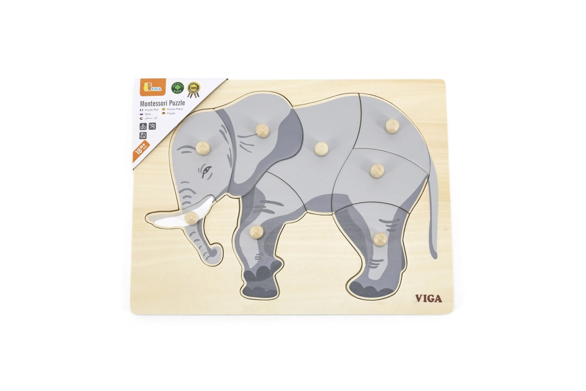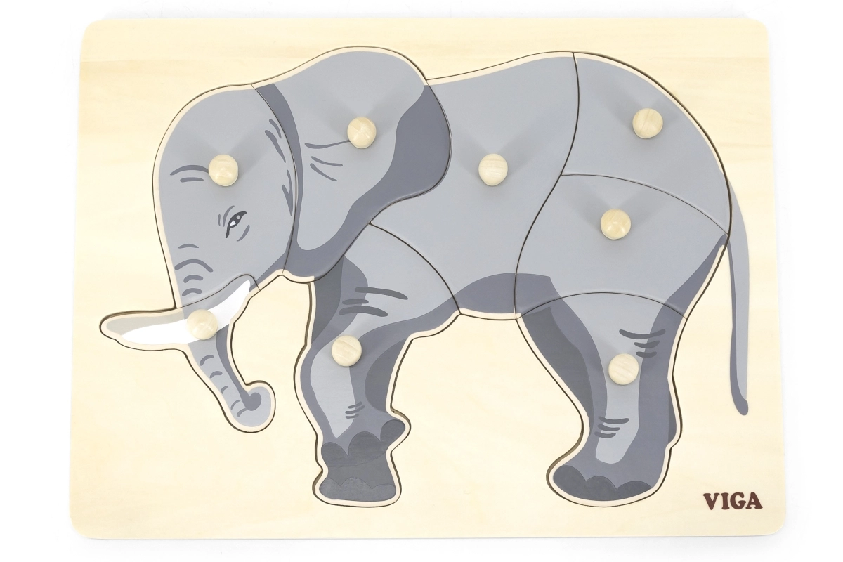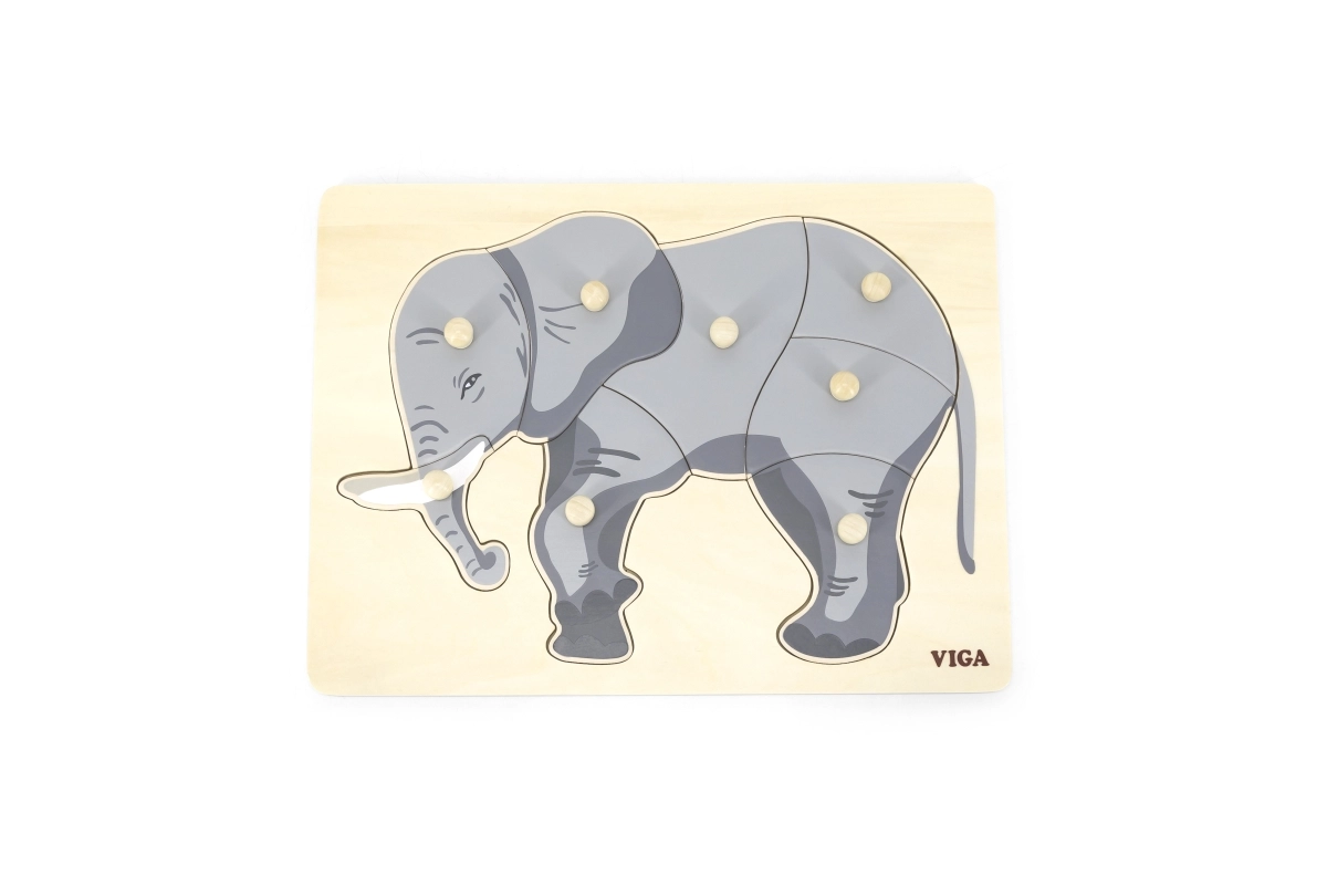 Šis skaistais koka ieliktnis ar ziloņa motīvu ir ideāli piemērots bērnu kognitīvo prasmju un sīkās motorikas attīstībai. Visām detaļām ir rokturi, kas bērniem nodrošina vieglu manipulāciju.