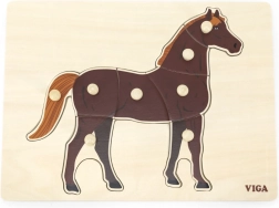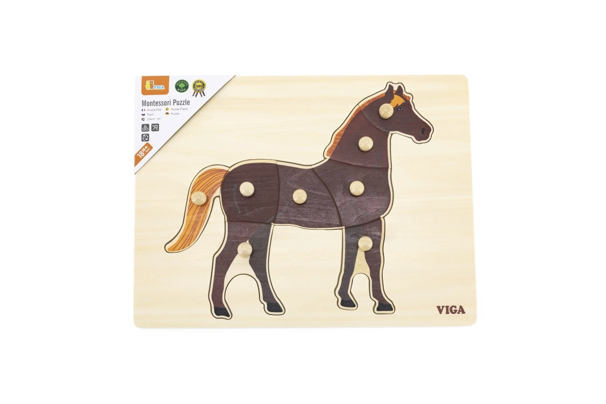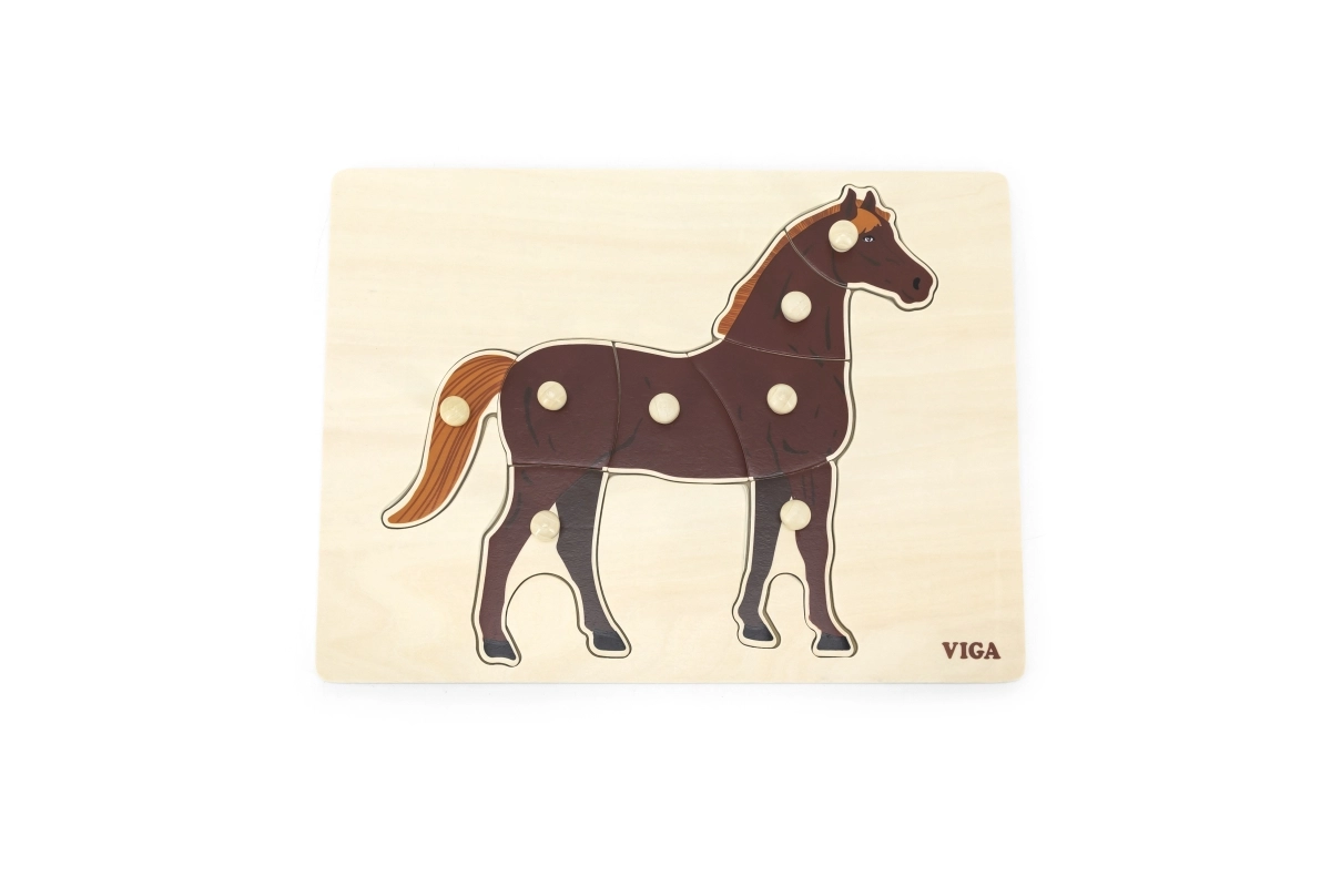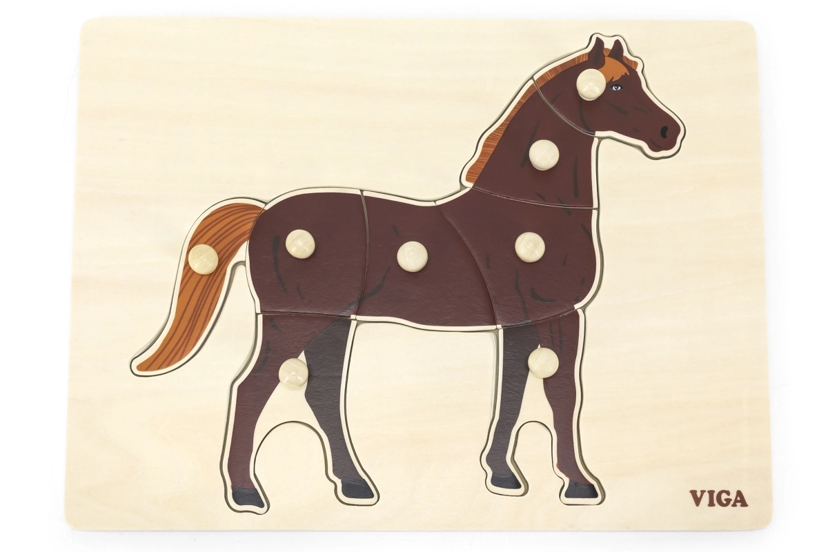 Montessori ieliktnis ar realistisku zirga motīvu rosina bērnus patstāvīgi atklāt un koncentrēties. Ar ērtiem rokturiem ir viegli satvert atsevišķas detaļas, mācīties atpazīt formas un trenēt kustību precizitāti. Dabīgā koka un brūnā zirga kontrasts padara kontūras skaidri saskatāmas un aicina uz spēli.
