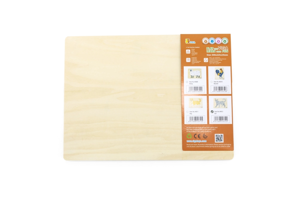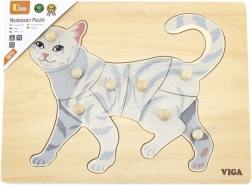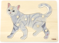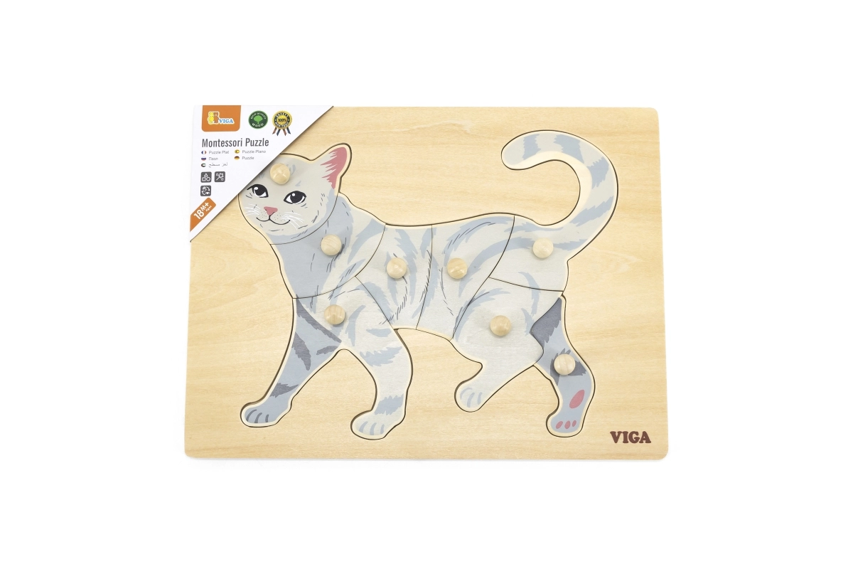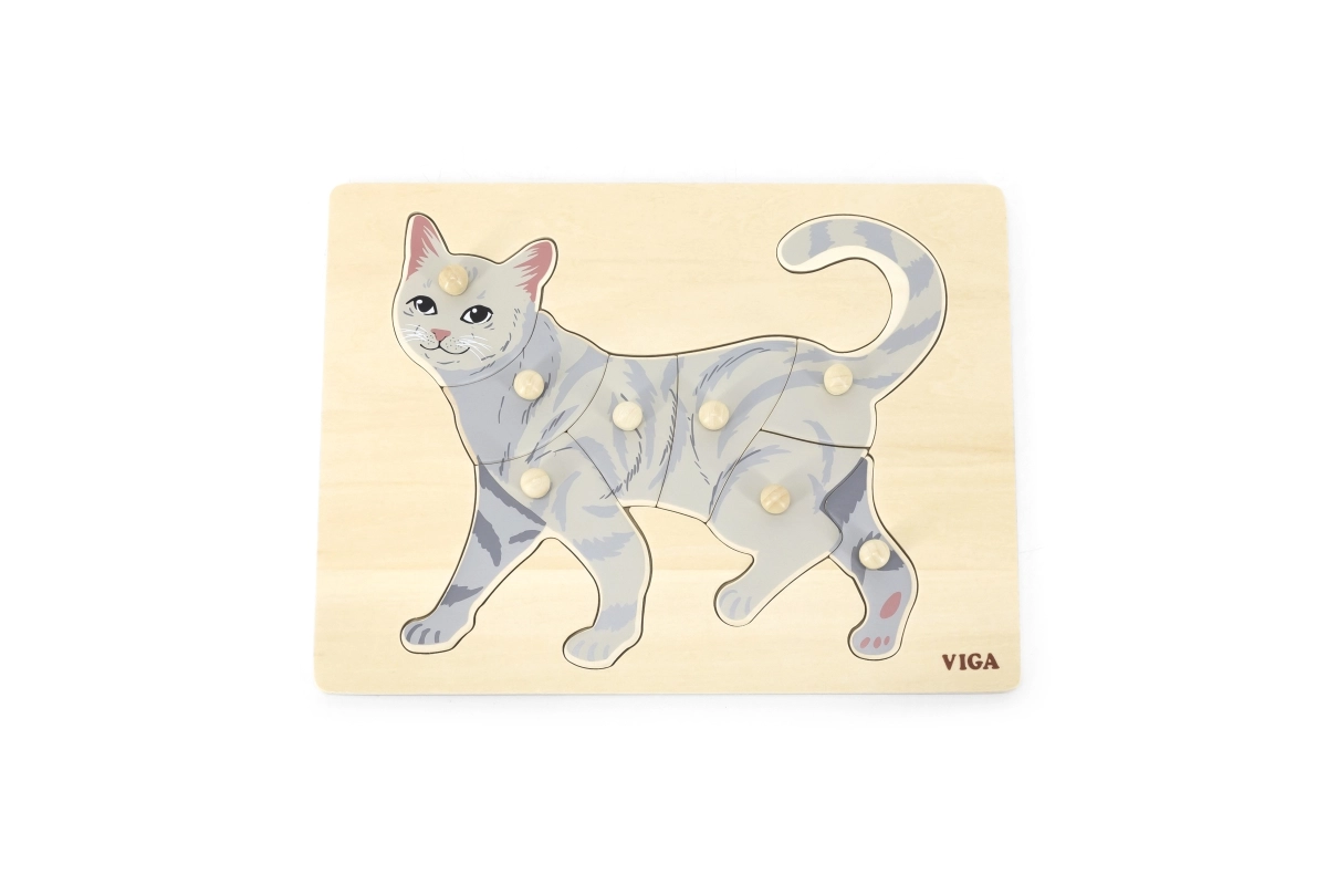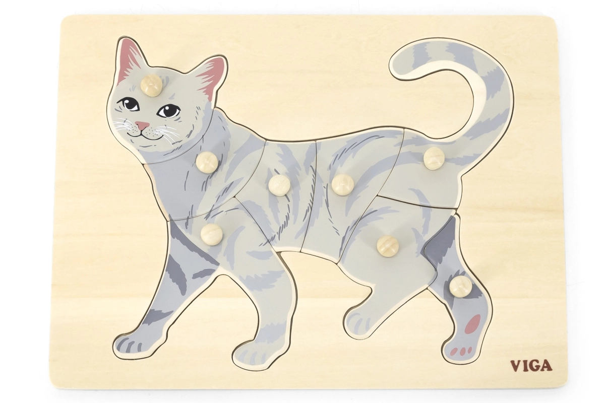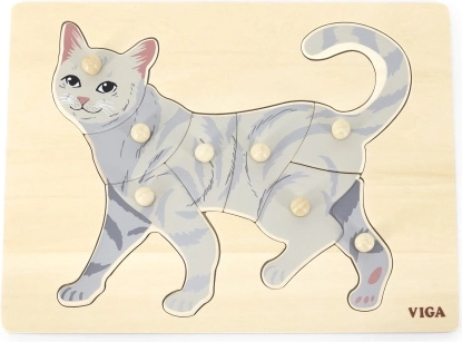 Bērna uzdevums ir salikt kaķa attēlu ne tikai pēc ilustrācijas, bet arī pēc atsevišķu detaļu formas. Pogtipa rokturi atvieglo satveršanu ar mazajiem pirkstiņiem un sekmē pareizu rokas vadību. Izturīgā koka pamatne droši notur detaļas savā vietā un iztur ikdienas lietošanu.