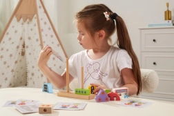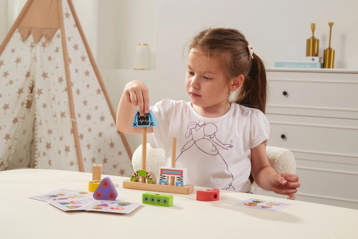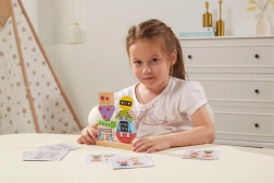 Komplektā ir kartītes ar dažādiem paraugiem – bērni trenē loģiku, uzmanību un precizitāti, veidojot soli pa solim.