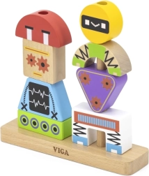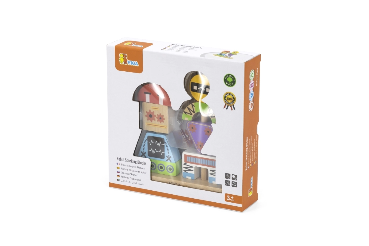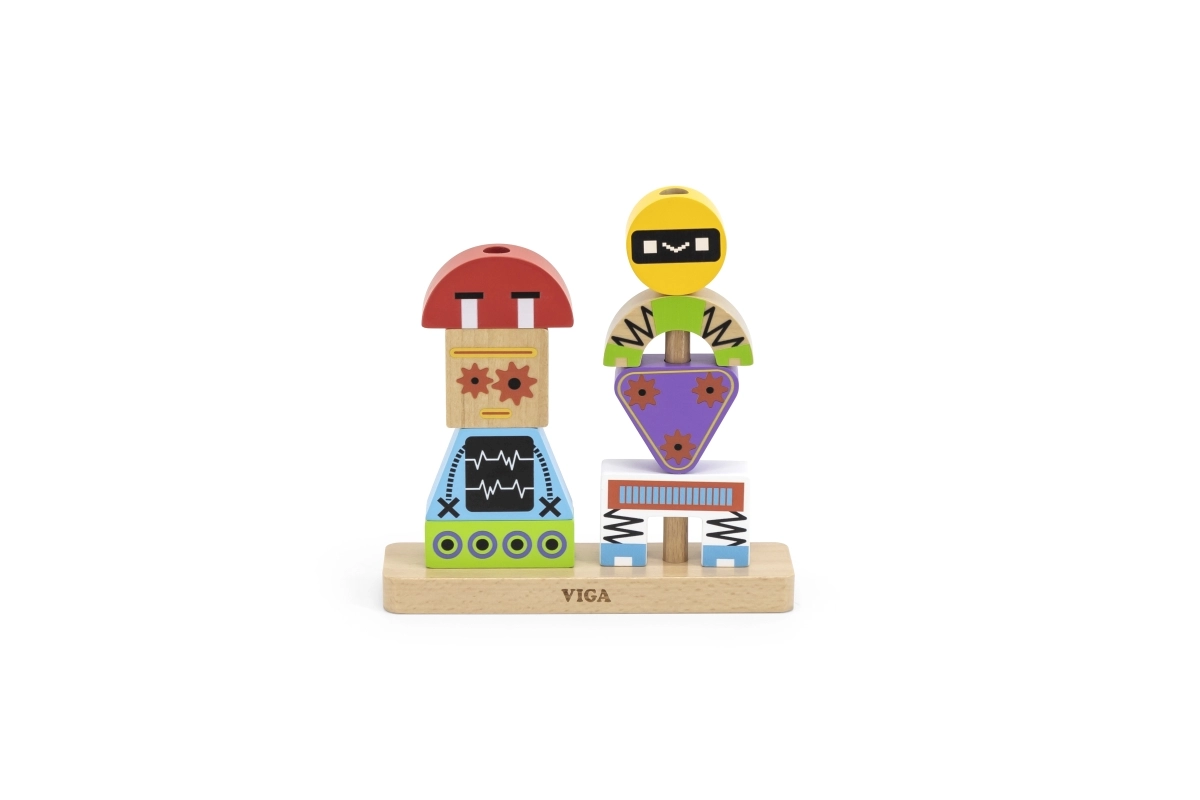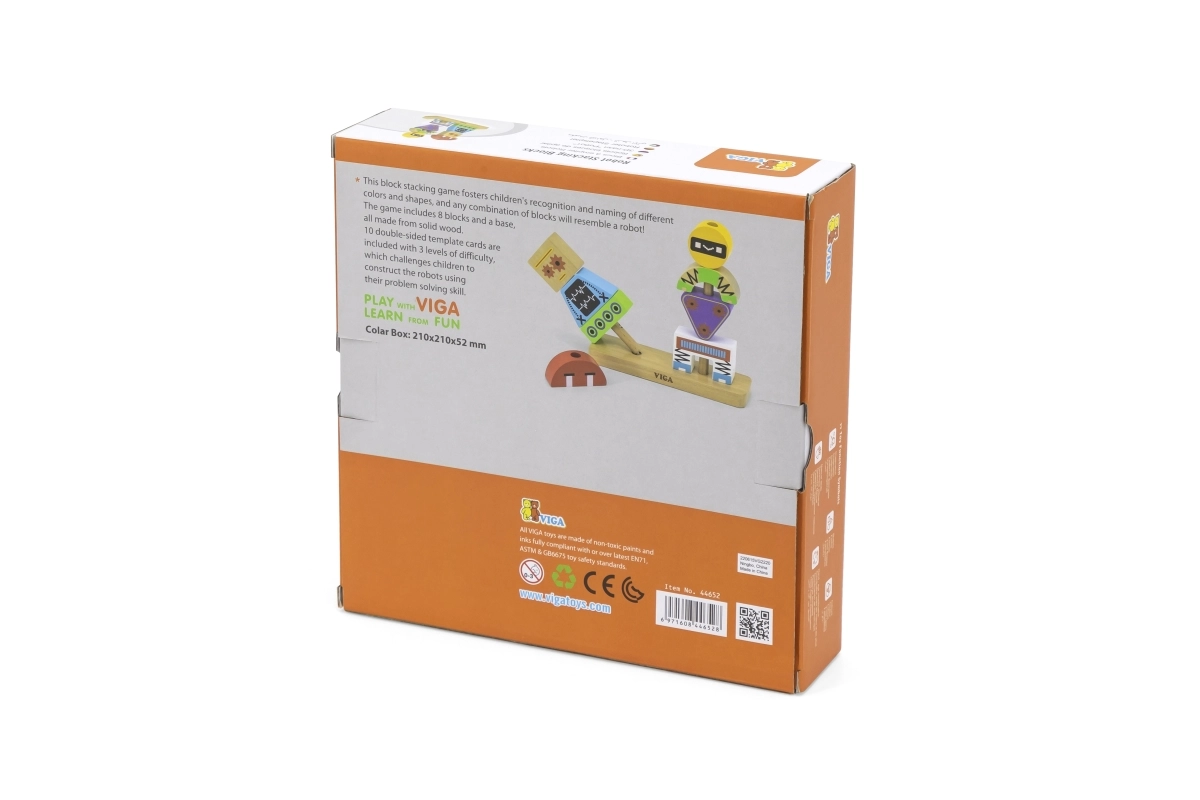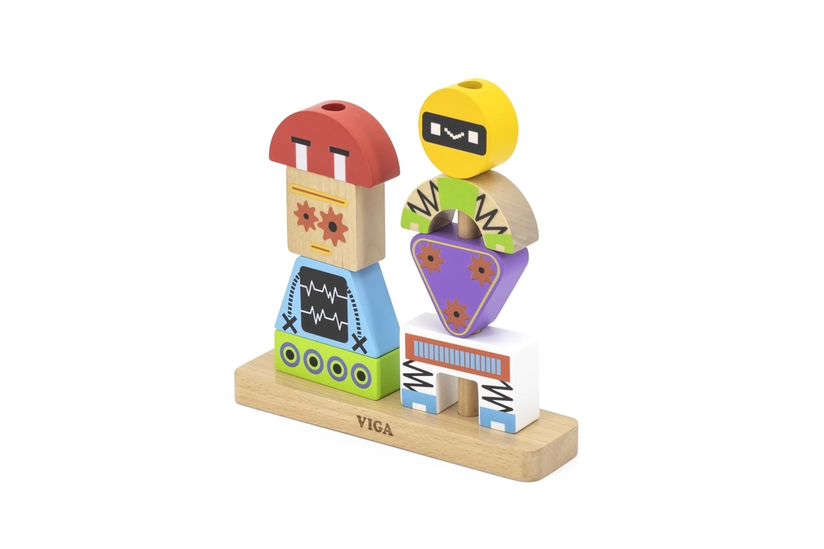 Krāsaina koka saliekamā VIGA spēle bērniem no 3 gadiem attīsta radošumu, sīko motoriku un loģisko domāšanu. No 8 izturīgām detaļām bērni var izveidot jautrus robotus pēc paraugu kartītēm vai pēc savas fantāzijas. Droša izgatavošana no dižskābarža koka ar netoksiskām krāsām un praktisks dāvanu iesaiņojums.