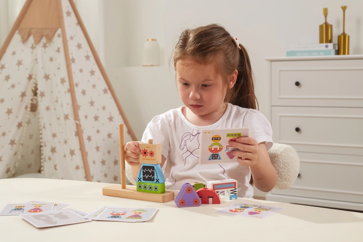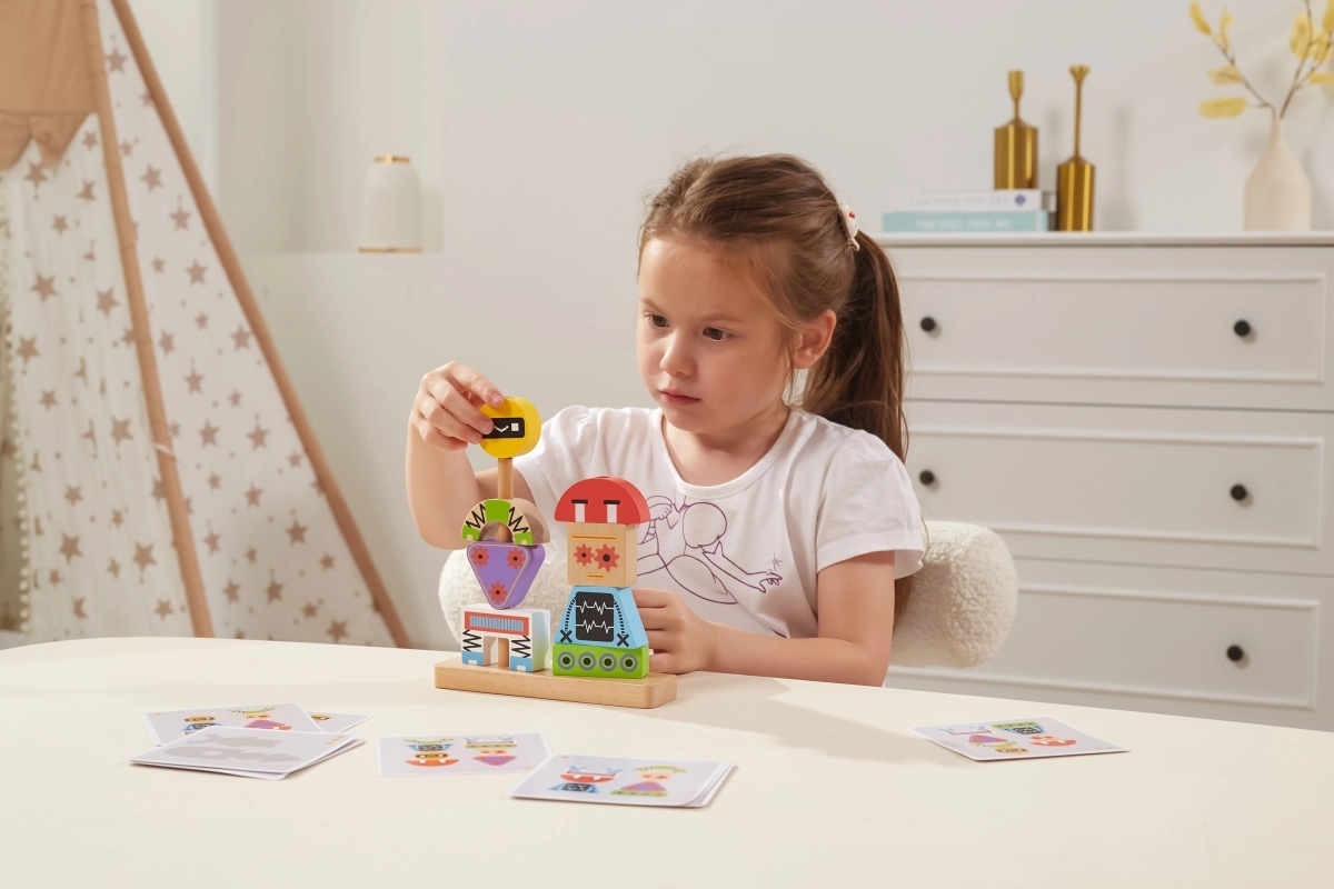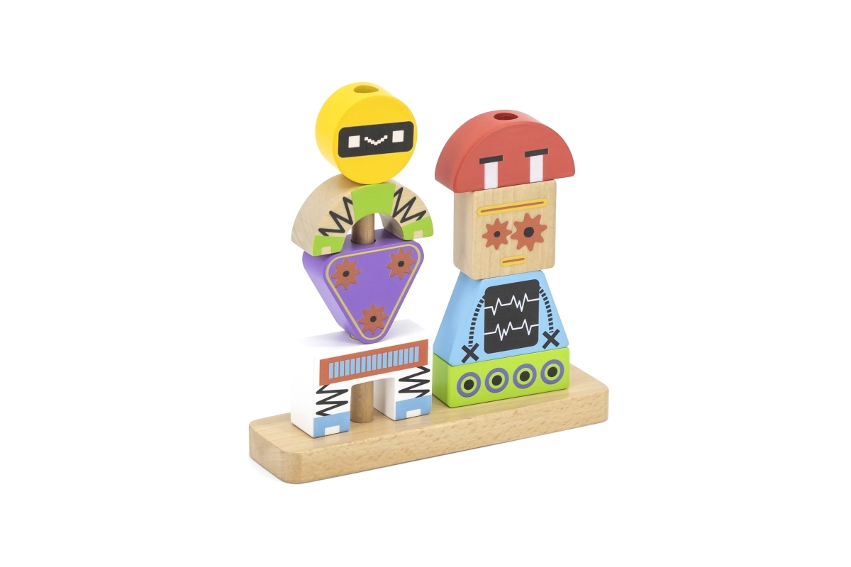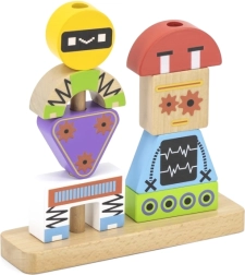 Atklājiet gudru rotaļlietu, kas aug kopā ar bērniem. Koka detaļas dažādās formās un krāsās viegli uzliekamas uz pamatnes tapām un ļauj veidot dažādas robotu figūras. Pievienotās paraugu kartītes ved no vienkāršām līdz sarežģītākām kombinācijām un attīsta koncentrēšanos un pacietību.