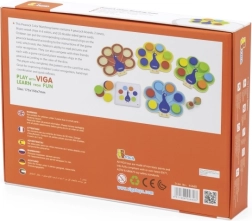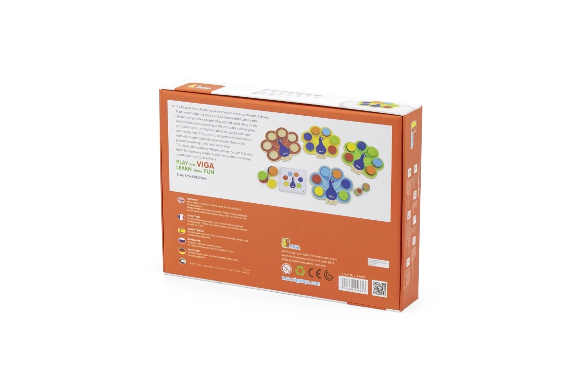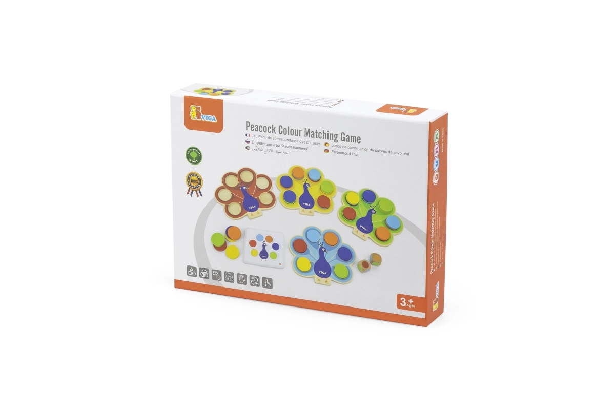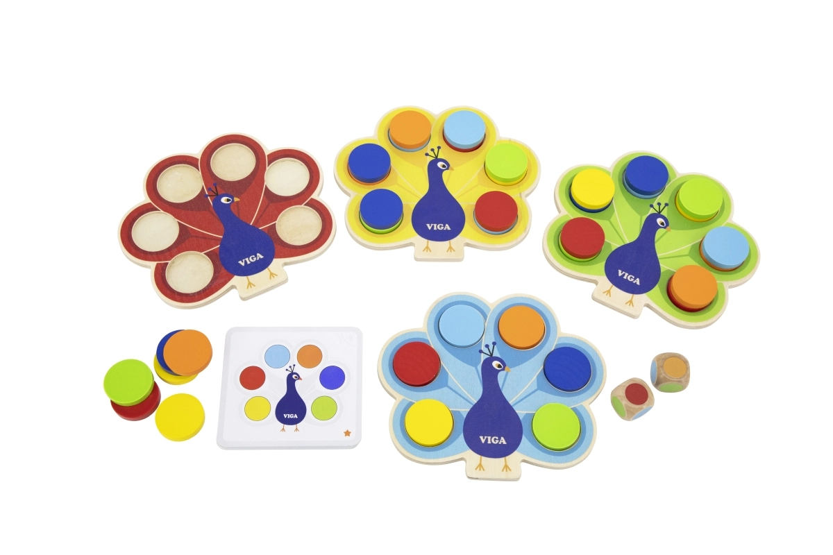 Bērnu izglītojošā spēle VIGA pāvs rotaļīgā veidā māca krāsu atpazīšanu, attīsta sīko motoriku un acu–roku koordināciju. Krāsainie ripuļi tiek ievietoti pāva astē pēc kartītēm vai metot krāsaino kauliņu – ideāli piemērota Montessori mācībām, koncentrēšanās treniņam un kopīgai spēlei.